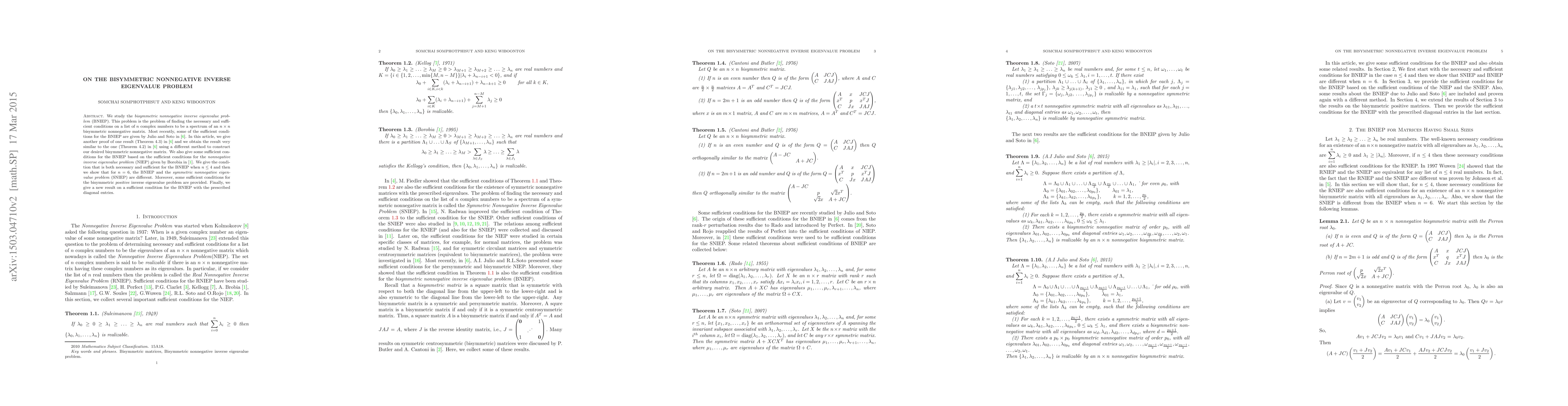 This paper explores the bisymmetric nonnegative inverse eigenvalue problem (BNIEP), providing new proofs and conditions for when a list of complex numbers can be the spectrum of a bisymmetric nonnegative matrix. It also differentiates BNIEP from the symmetric nonnegative eigenvalue problem for specific dimensions.
