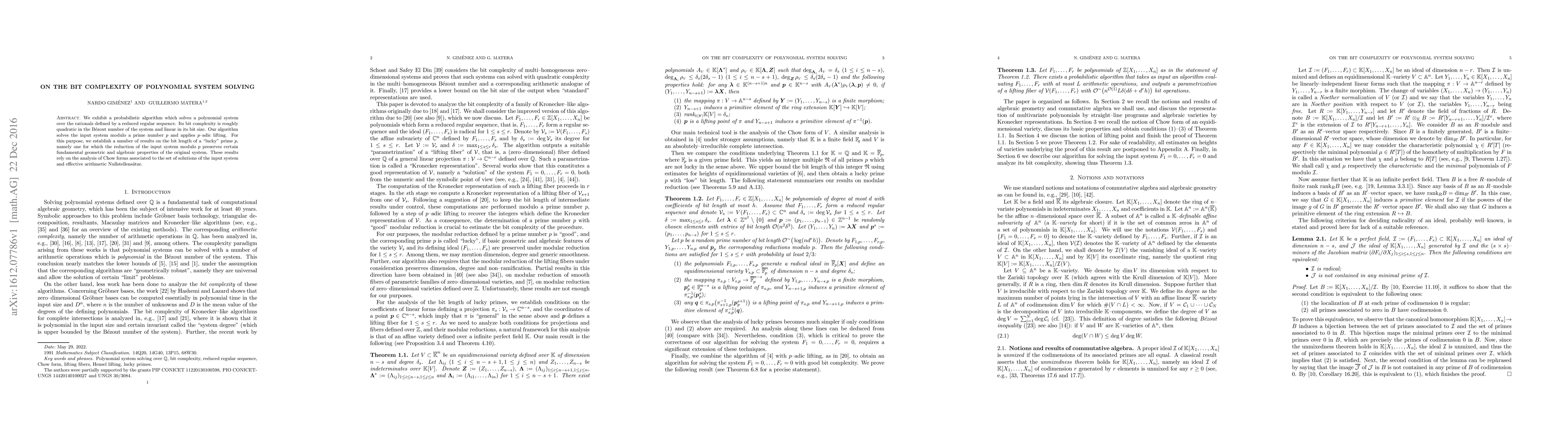 This paper presents a probabilistic algorithm for solving polynomial systems over rationals with bit complexity quadratic in the B\'ezout number and linear in bit size. The algorithm uses modular reduction with a prime number p and p-adic lifting, relying on results about the bit length of "lucky" primes that preserve system properties.