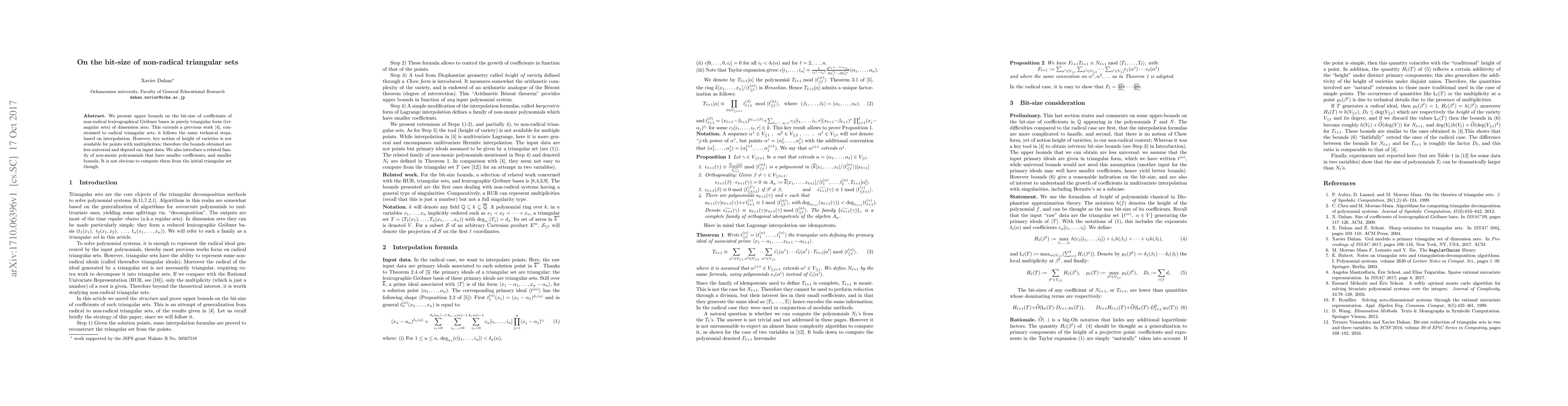 Researchers found upper bounds on the bit-size of coefficients in non-radical triangular sets, extending previous work to a wider range of cases. Their method uses interpolation and introduces related polynomials with smaller coefficients.