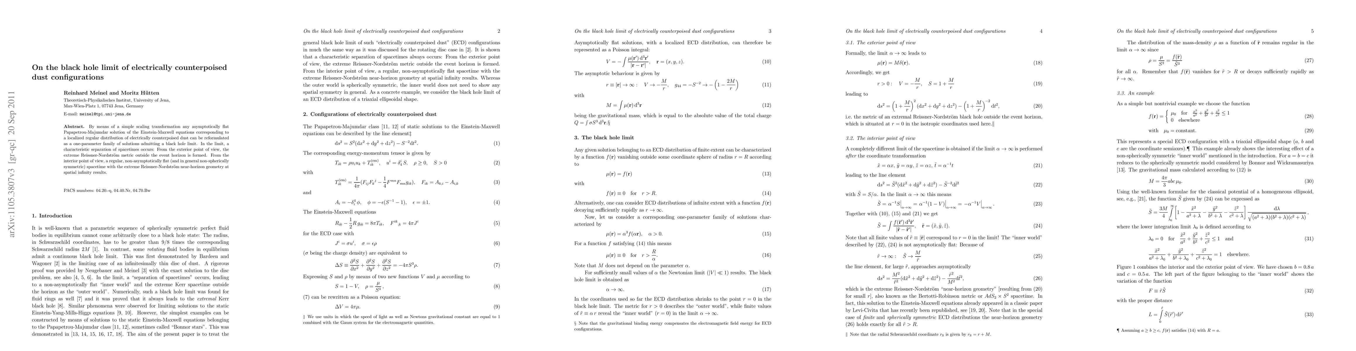 This paper explores the black hole limit of electrically counterpoised dust configurations using a scaling transformation on Papapetrou-Majumdar solutions. It reveals a black hole formation where the exterior resembles the extreme Reissner-Nordstrom metric, while the interior exhibits a regular, non-spherically symmetric spacetime with extreme Reissner-Nordstrom geometry near infinity.