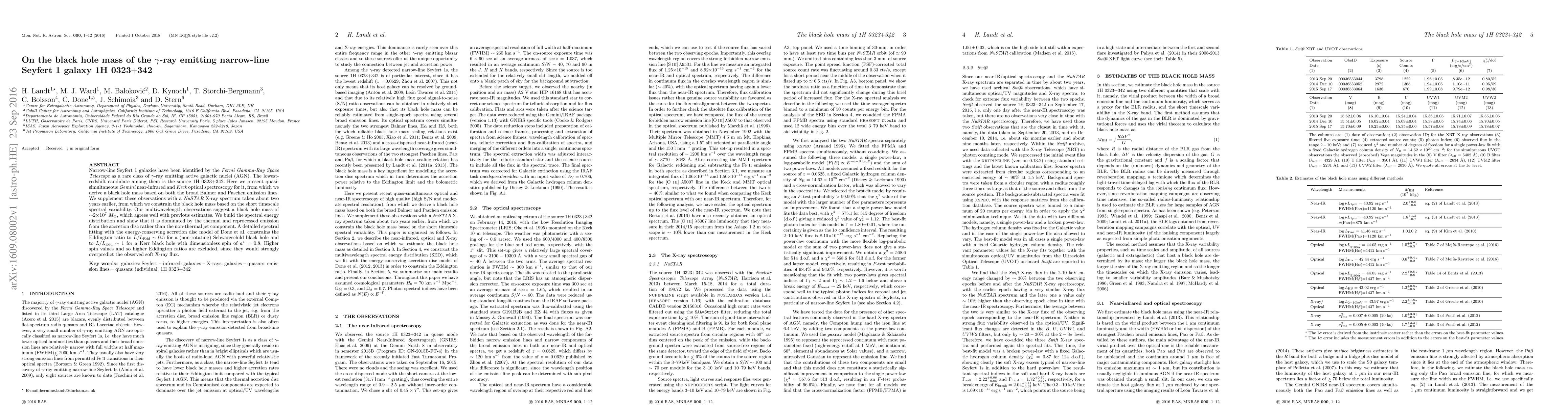 Narrow-line Seyfert 1 galaxies have been identified by the Fermi Gamma-Ray Space Telescope as a rare class of gamma-ray emitting active galactic nuclei (AGN). The lowest-redshift candidate among them is the source 1H 0323+342. Here we present quasi-simultaneous Gemini near-infrared and Keck optical spectroscopy for it, from which we derive a black hole mass based on both the broad Balmer and Paschen emission lines. We supplement these observations with a NuSTAR X-ray spectrum taken about two years earlier, from which we constrain the black hole mass based on the short timescale spectral variability. Our multiwavelength observations suggest a black hole mass of ~2x10^7 solar masses, which agrees well with previous estimates. We build the spectral energy distribution and show that it is dominated by the thermal and reprocessed emission from the accretion disc rather than the non-thermal jet component. A detailed spectral fitting with the energy-conserving accretion disc model of Done et al. constrains the Eddington ratio to L/L_Edd ~ 0.5 for a (non-rotating) Schwarzschild black hole and to L/L_Edd ~ 1 for a Kerr black hole with dimensionless spin of a*=0.8. Higher spin values and so higher Eddington ratios are excluded, since they would strongly overpredict the observed soft X-ray flux.