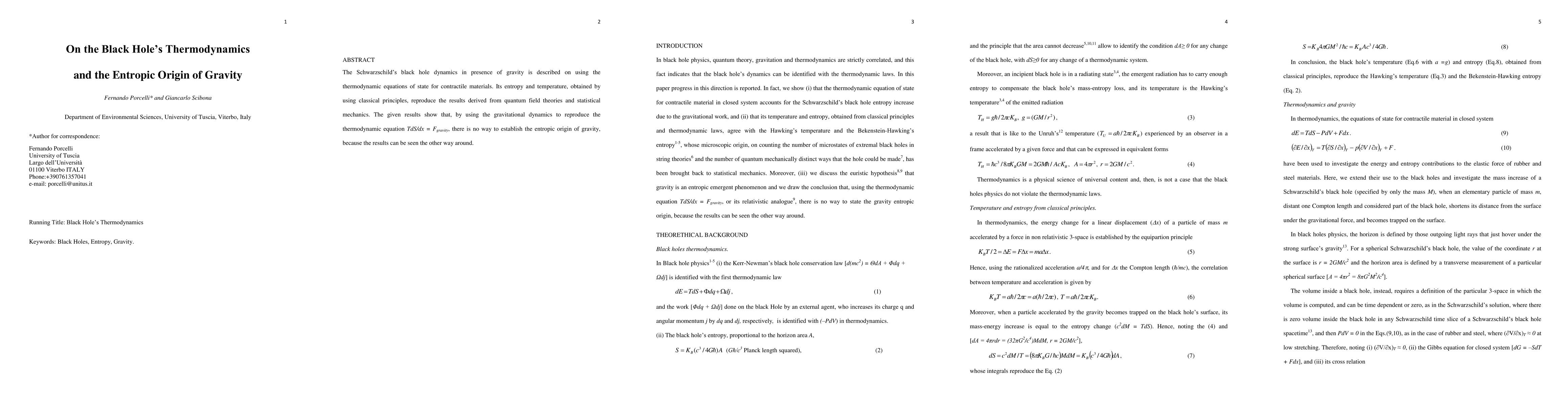The Schwarzschild's black hole dynamics in presence of gravity is described on using the thermodynamic equations of state for contractile materials. Its entropy and temperature, obtained by using classical principles, reproduce the results derived from quantum field theories and statistical mechanics. The given results show that, by using the gravitational dynamics to reproduce the thermodynamic equation TdS/dx = Fgravity, there is no way to establish the entropic origin of gravity, because the results can be seen the other way around.
