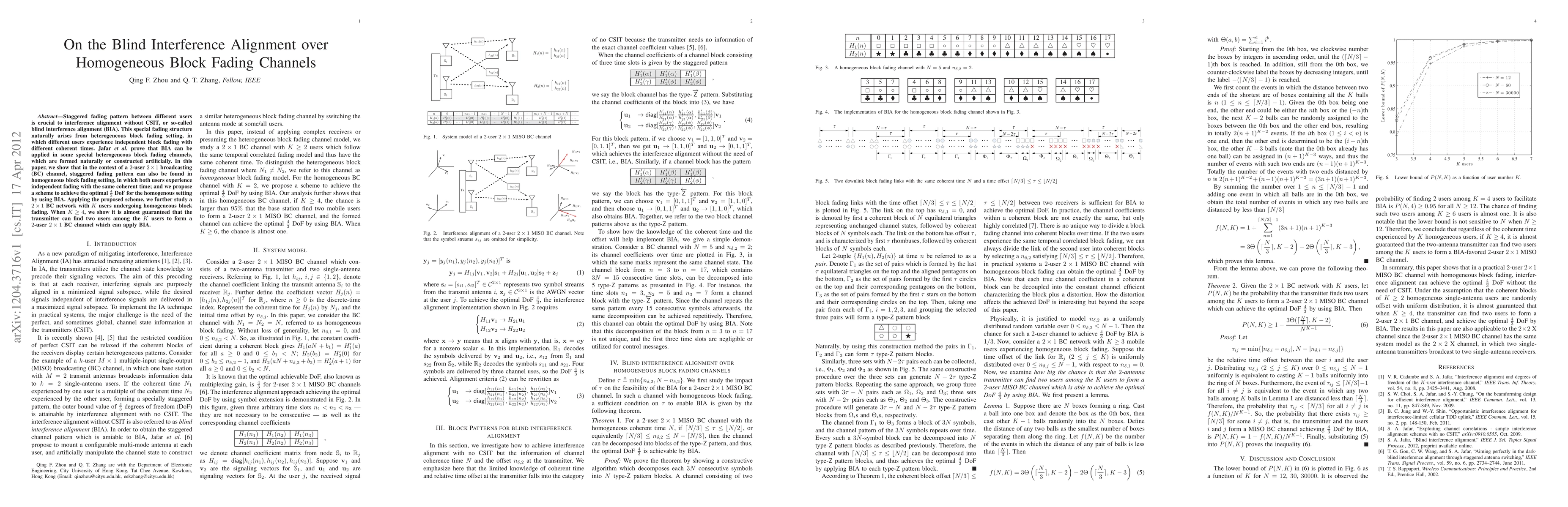 This paper demonstrates that staggered fading patterns, essential for blind interference alignment (BIA), can occur in homogeneous block fading channels, where both users experience identical fading with the same coherent time. The authors propose a scheme achieving optimal 4/3 degrees of freedom (DoF) for a 2-user 2x1 broadcasting channel, and extend this to a 2x1 broadcasting network with K users, showing BIA applicability for K>=4.