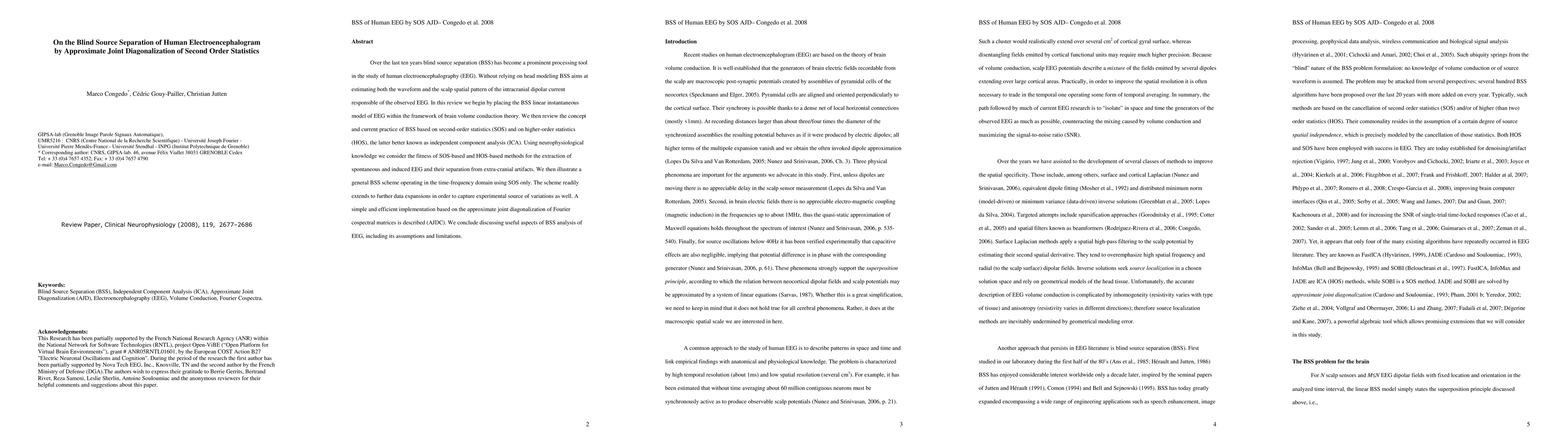 This paper reviews blind source separation methods for EEG, focusing on second-order statistics and time-frequency analysis, with a new efficient implementation using approximate joint diagonalization of Fourier cospectral matrices.