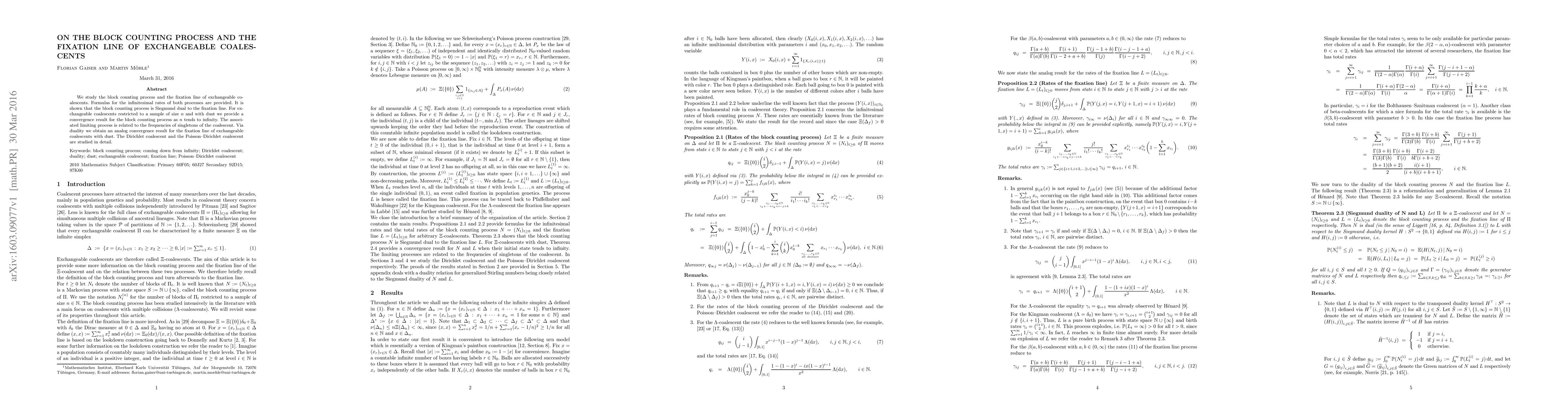 This paper investigates the block counting process and the fixation line in exchangeable coalescents, providing formulas for their infinitesimal rates and demonstrating the dual relationship between the two processes. It also presents convergence results for these processes as sample size tends to infinity, revealing their limiting behavior related to singleton frequencies, and applies these findings to the Dirichlet and Poisson-Dirichlet coalescents.