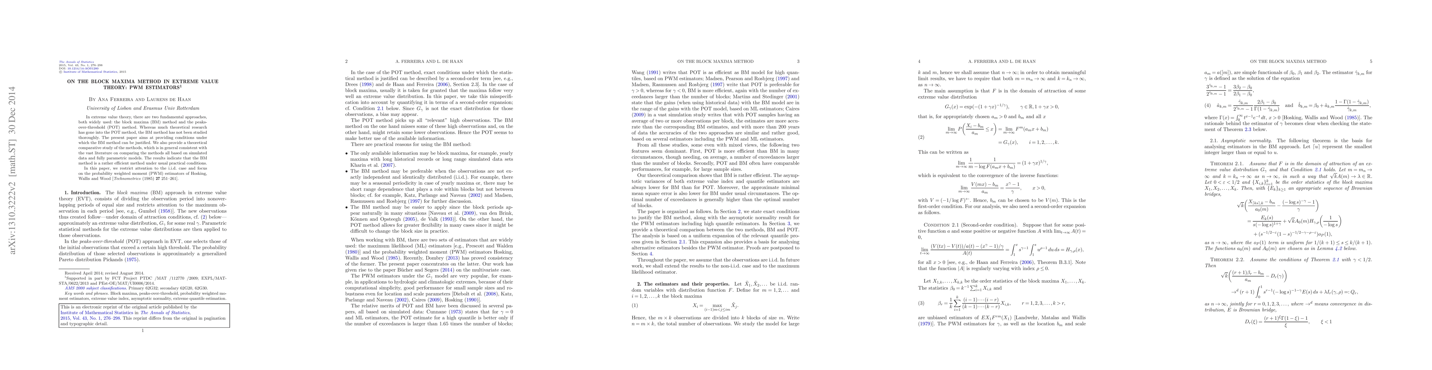 In extreme value theory, there are two fundamental approaches, both widely used: the block maxima (BM) method and the peaks-over-threshold (POT) method. Whereas much theoretical research has gone into the POT method, the BM method has not been studied thoroughly. The present paper aims at providing conditions under which the BM method can be justified. We also provide a theoretical comparative study of the methods, which is in general consistent with the vast literature on comparing the methods all based on simulated data and fully parametric models. The results indicate that the BM method is a rather efficient method under usual practical conditions. In this paper, we restrict attention to the i.i.d. case and focus on the probability weighted moment (PWM) estimators of Hosking, Wallis and Wood [Technometrics (1985) 27 251-261].