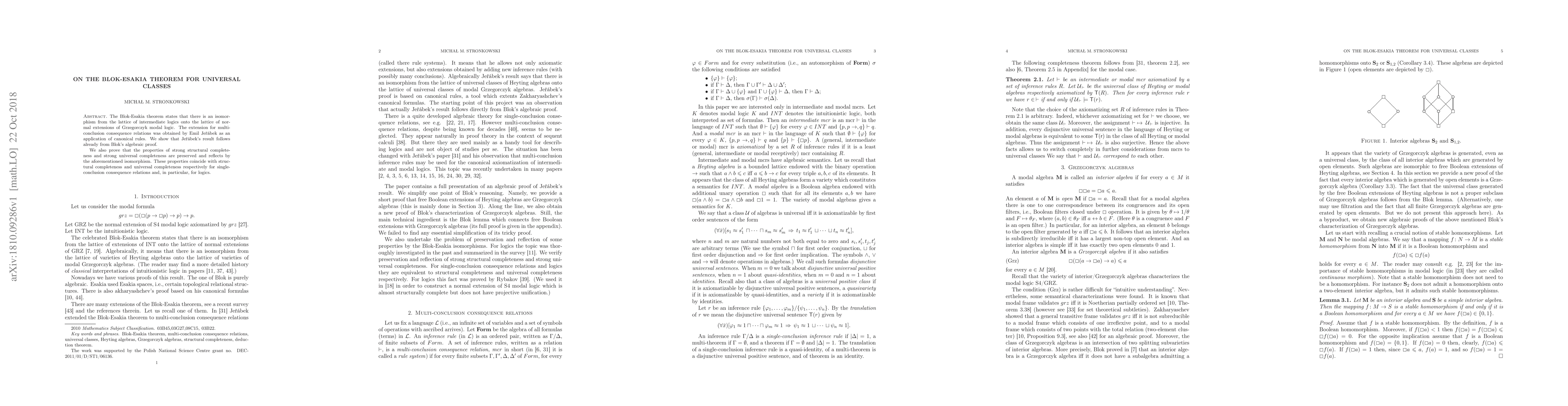The Blok-Esakia theorem is shown to extend to universal classes via an algebraic proof by Blok, preserving strong structural and universal completeness. Jeřábek's extension using canonical rules is demonstrated to be a consequence of Blok's original proof.