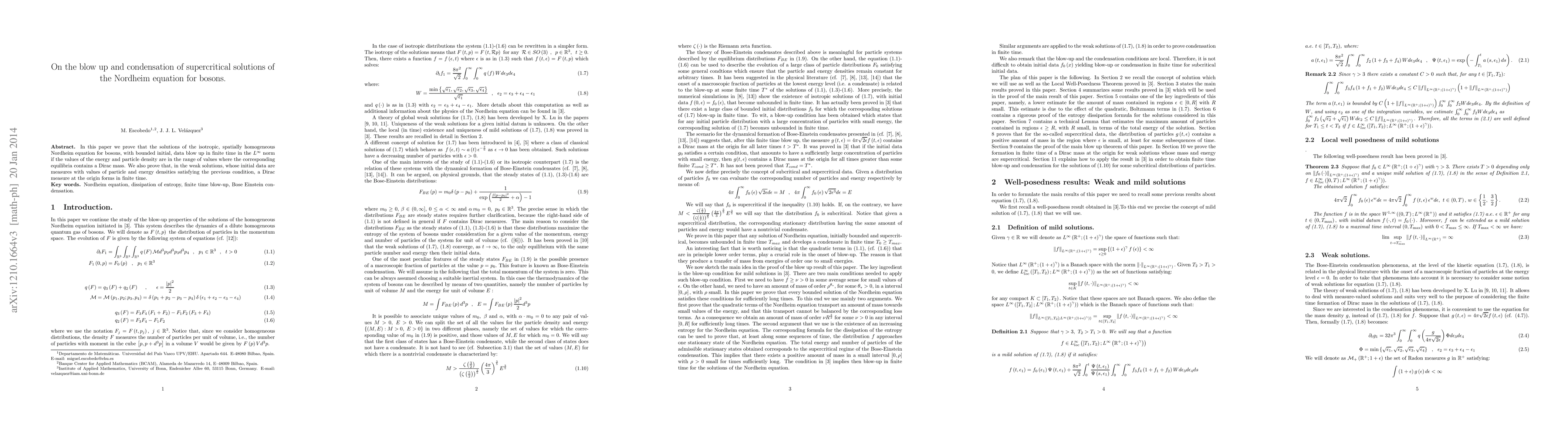 In this paper we prove that the solutions of the isotropic, spatially homogeneous Nordheim equation for bosons, with bounded initial, data blow up in finite time in the $L^\infty$ norm if the values of the energy and particle density are in the range of values where the corresponding equilibria contains a Dirac mass. We also prove that, in the weak solutions, whose initial data are measures with values of particle and energy densities satisfying the previous condition, a Dirac measure at the origin forms in finite time.