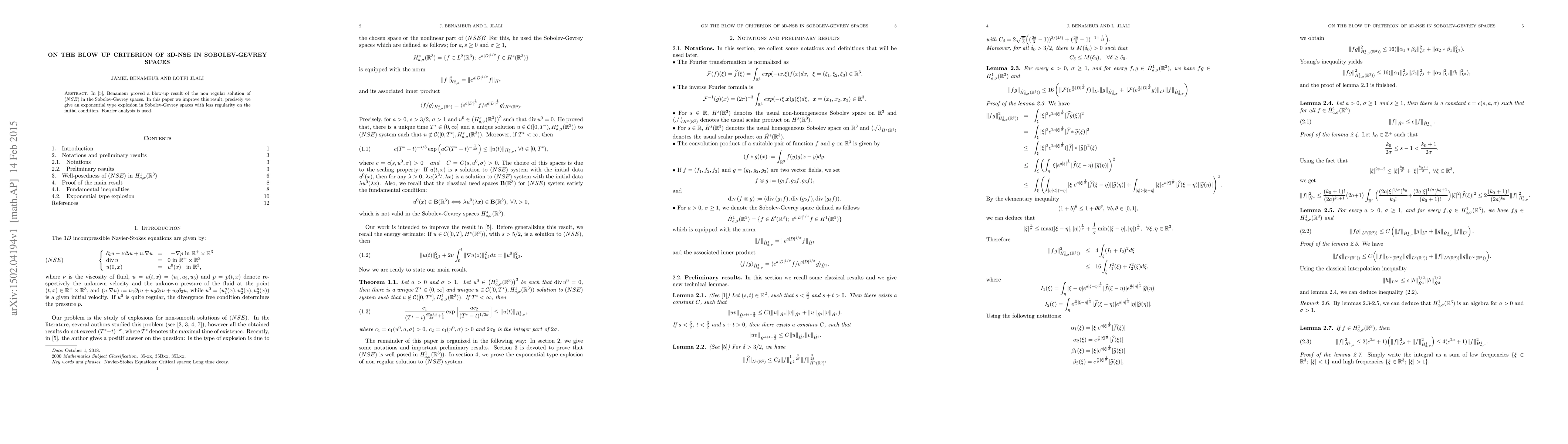 This paper improves upon Benameur's blow-up result for the 3D Navier-Stokes equations in Sobolev-Gevrey spaces, providing an exponential explosion criterion with less stringent initial condition regularity, utilizing Fourier analysis techniques.
