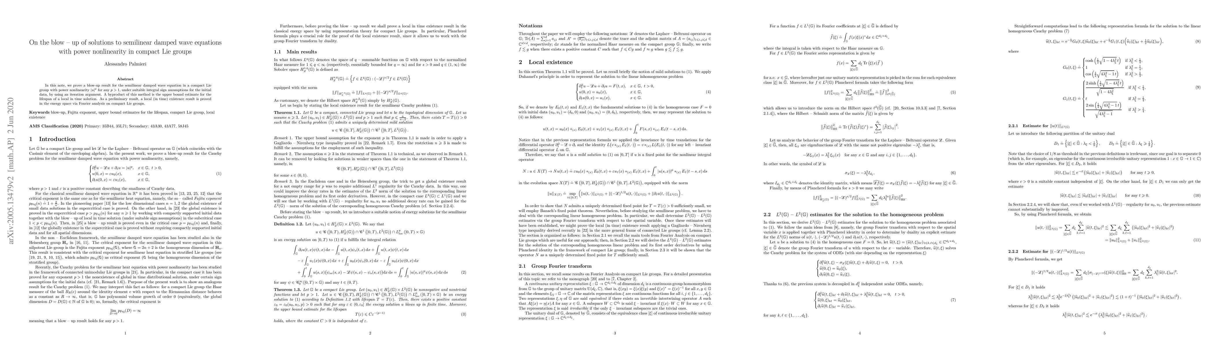 Researchers prove a blow-up result for semilinear damped wave equations with power nonlinearity in compact Lie groups, showing that solutions with certain initial conditions will inevitably reach a maximum value over time.