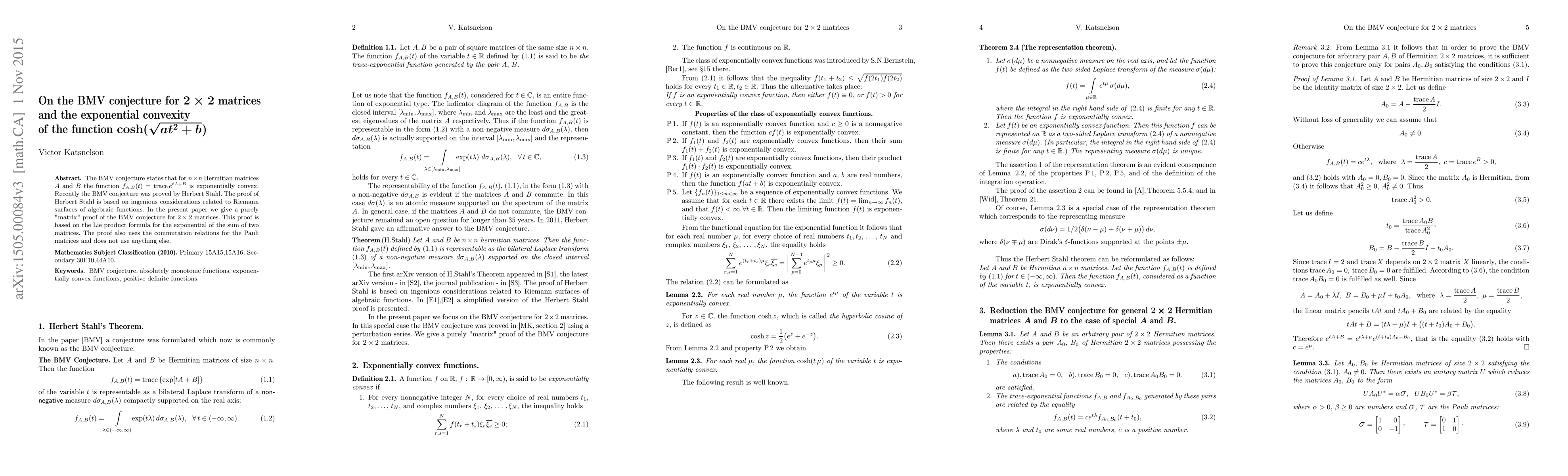 The BMV conjecture states that for \(n\times n\) Hermitian matrices \(A\) and \(B\) the function \(f_{A,B}(t)=\tr e^{tA+B}\) is exponentially convex. Recently the BMV conjecture was proved by Herbert Stahl. The proof of Herbert Stahl is based on ingenious considerations related to Riemann surfaces of algebraic functions. In the present paper we give a purely "matrix" proof of the BMV conjecture for \(2\times2\) matrices. This proof is based on the Lie product formula for the exponential of the sum of two matrices. The proof also uses the commutation relations for the Pauli matrices and does not use anything else.