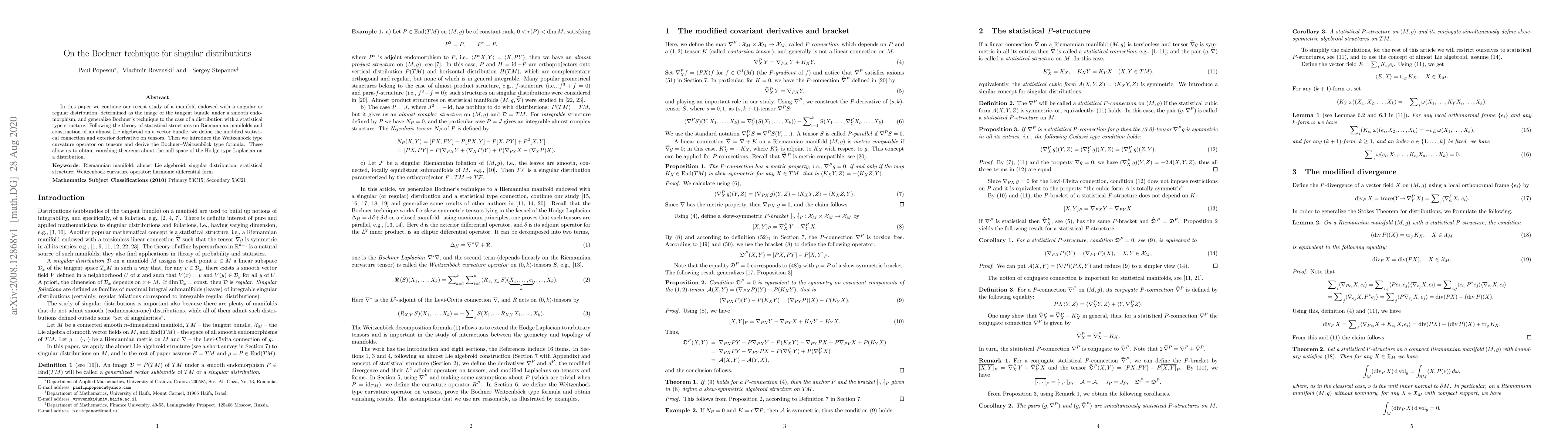 In this paper we continue our recent study of a manifold endowed with a singular or regular distribution, determined as the image of the tangent bundle under a smooth endomorphism, and generalize Bochner's technique to the case of a distribution with a statistical type structure. Following the theory of statistical structures on Riemannian manifolds and construction of an almost Lie algebroid on a vector bundle, we define the modified statistical connection and exterior derivative on tensors. Then we introduce the Weitzenbock type curvature operator on tensors and derive the Bochner-Weitzenbock type formula. These allow us to obtain vanishing theorems about the null space of the Hodge type Laplacian on a distribution.