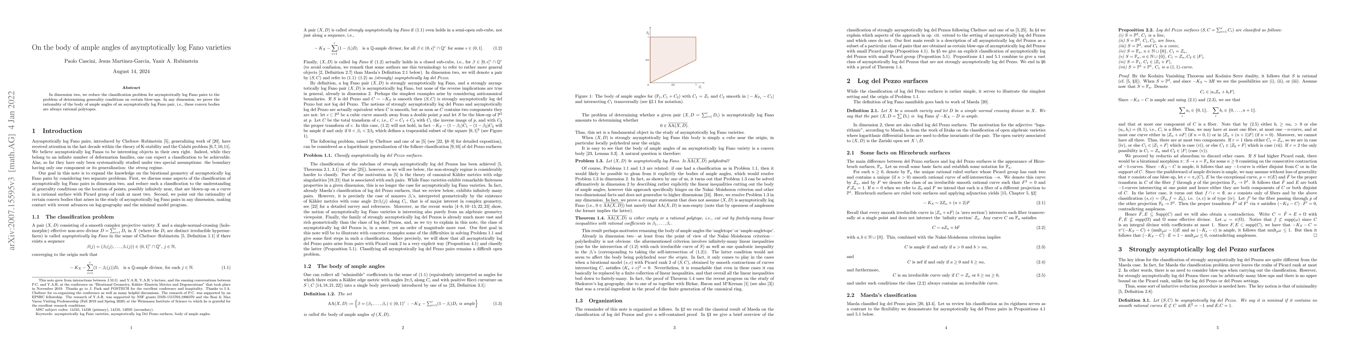 In dimension two, we reduce the classification problem for asymptotically log Fano pairs to the problem of determining generality conditions on certain blow-ups. In any dimension, we prove the rationality of the body of ample angles of an asymptotically log Fano pair, i.e., these convex bodies are always rational polytopes.