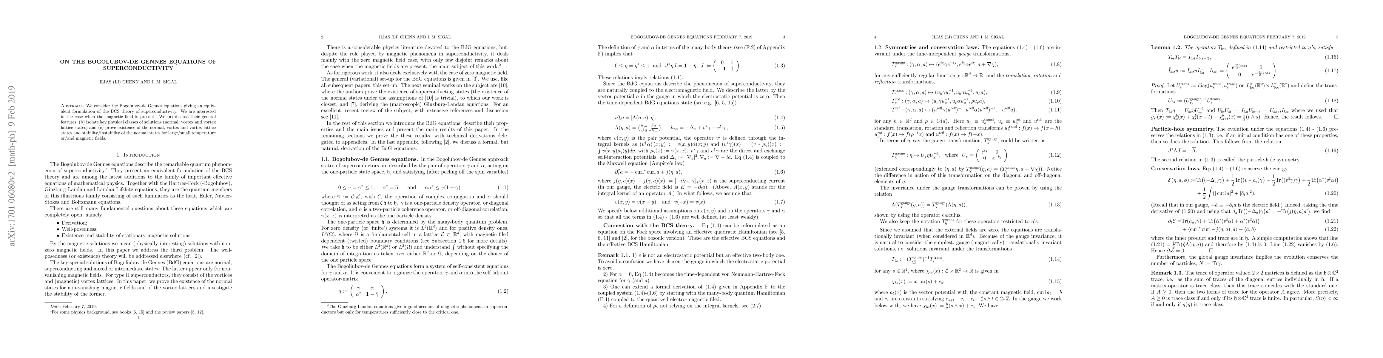 We consider the Bogolubov-de Gennes equations giving an equivalent formulation of the BCS theory of superconductivity. We are interested in the case when the magnetic field is present. We (a) discuss their general features, (b) isolate key physical classes of solutions (normal, vortex and vortex lattice states) and (c) prove existence of the normal, vortex and vortex lattice states and stability/instability of the normal states for large/small temperature or/and magnetic fields.