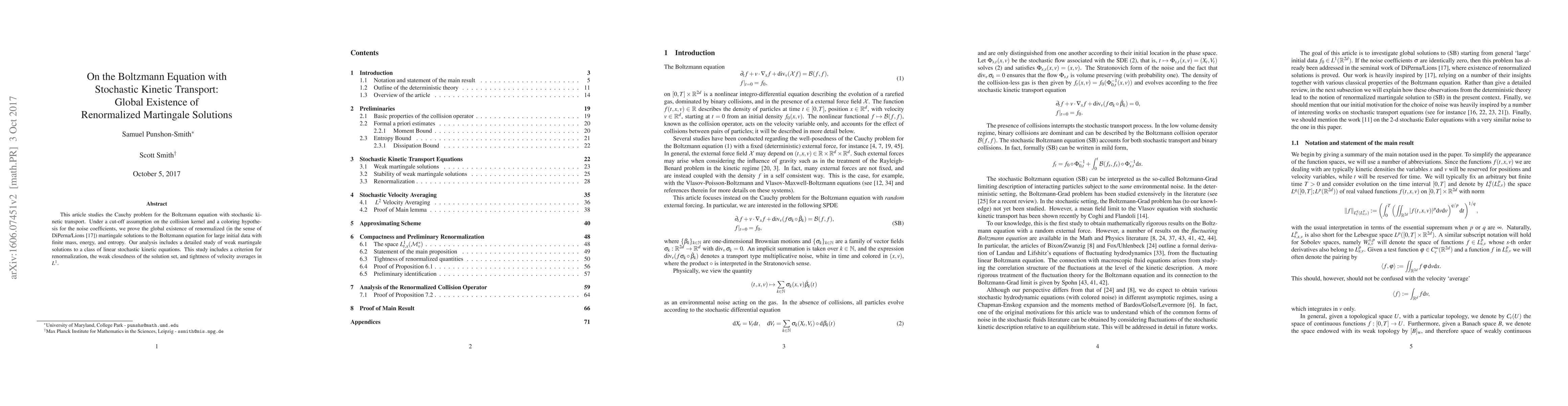 This paper proves global existence of renormalized martingale solutions for the Boltzmann equation with stochastic kinetic transport, under specific assumptions on the collision kernel and noise coefficients. The analysis includes criteria for renormalization, weak closedness, and tightness of velocity averages.