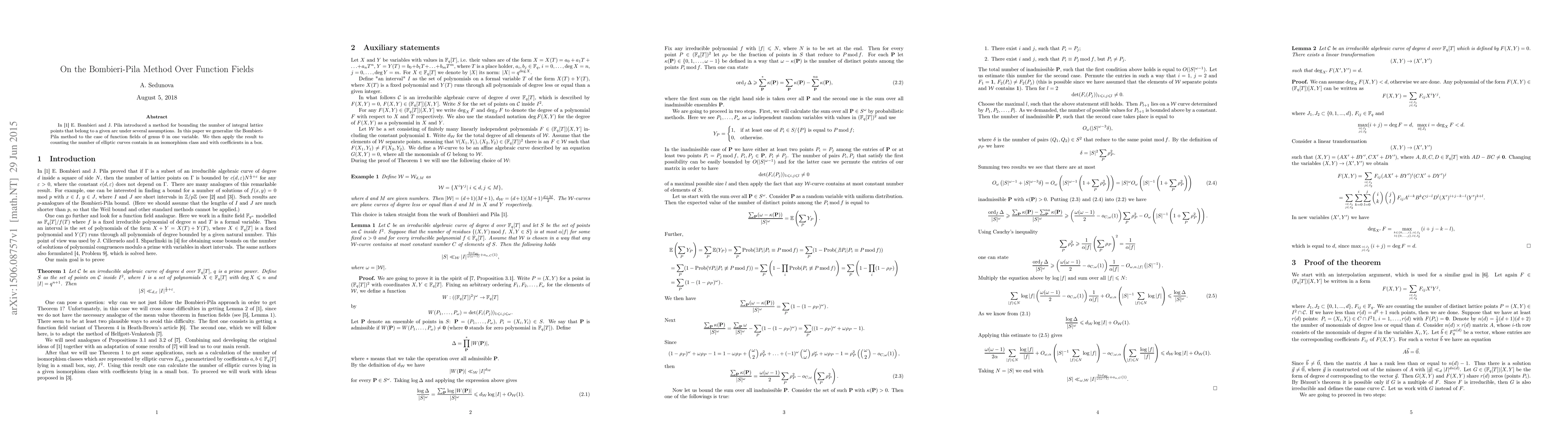 E. Bombieri and J. Pila introduced a method for bounding the number of integral lattice points that belong to a given arc under several assumptions. In this paper we generalize the Bombieri-Pila method to the case of function fields of genus 0 in one variable. We then apply the result to counting the number of elliptic curves contain in an isomorphism class and with coefficients in a box.