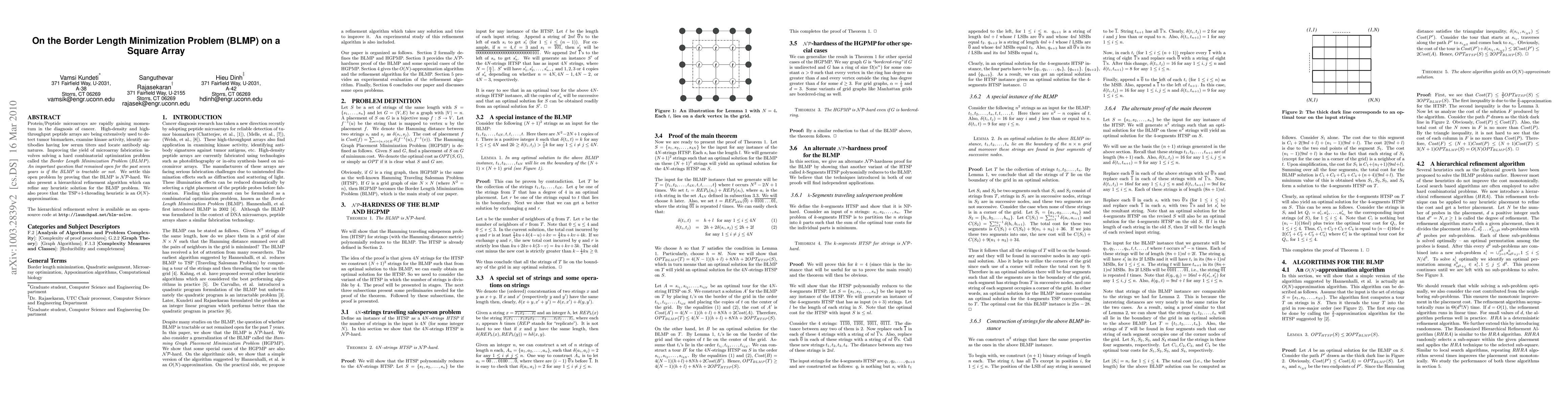 Protein/Peptide microarrays are rapidly gaining momentum in the diagnosis of cancer. High-density and highthroughput peptide arrays are being extensively used to detect tumor biomarkers, examine kinase activity, identify antibodies having low serum titers and locate antibody signatures. Improving the yield of microarray fabrication involves solving a hard combinatorial optimization problem called the Border Length Minimization Problem (BLMP). An important question that remained open for the past seven years is if the BLMP is tractable or not. We settle this open problem by proving that the BLMP is NP-hard. We also present a hierarchical refinement algorithm which can refine any heuristic solution for the BLMP problem. We also prove that the TSP+1-threading heuristic is an O(N)- approximation. The hierarchical refinement solver is available as an opensource code at http://launchpad.net/blm-solve.