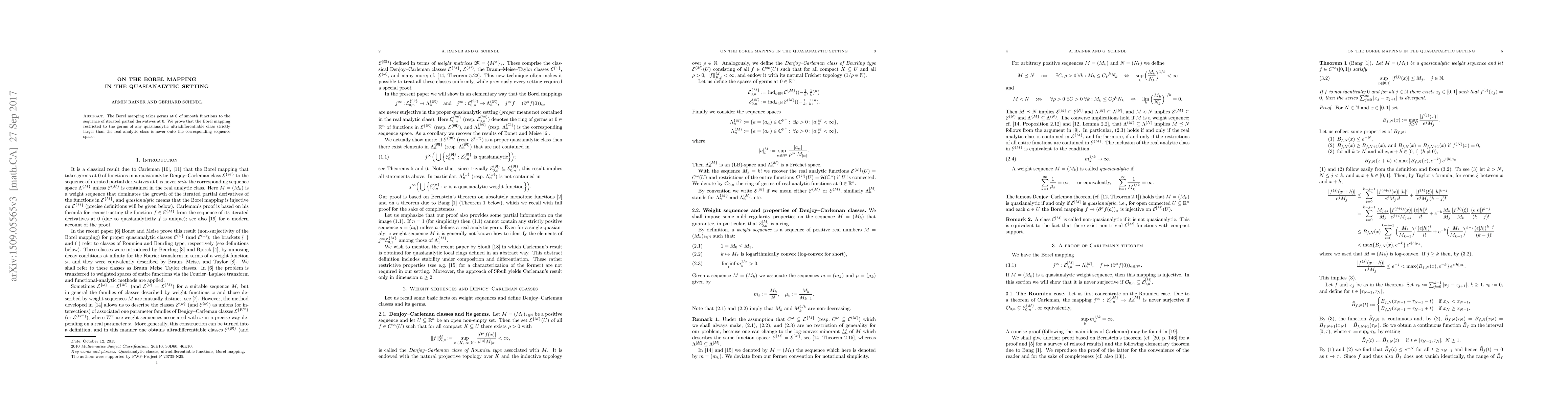 The Borel mapping takes germs at $0$ of smooth functions to the sequence of iterated partial derivatives at $0$. We prove that the Borel mapping restricted to the germs of any quasianalytic ultradifferentiable class strictly larger than the real analytic class is never onto the corresponding sequence space.
