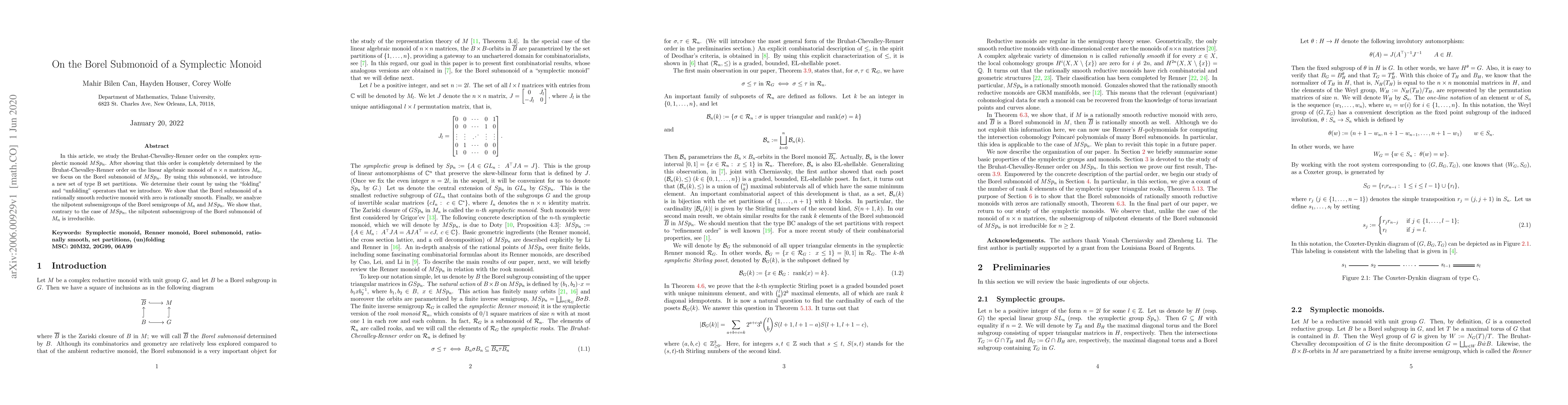 In this article, we study the Bruhat-Chevalley-Renner order on the complex symplectic monoid $MSp_n$. After showing that this order is completely determined by the Bruhat-Chevalley-Renner order on the linear algebraic monoid of $n\times n$ matrices $M_n$, we focus on the Borel submonoid of $MSp_n$. By using this submonoid, we introduce a new set of type B set partitions. We determine their count by using the ``folding'' and ``unfolding'' operators that we introduce. We show that the Borel submonoid of a rationally smooth reductive monoid with zero is rationally smooth. Finally, we analyze the nilpotent subsemigroups of the Borel semigroups of $M_n$ and $MSp_n$. We show that, contrary to the case of $MSp_n$, the nilpotent subsemigroup of the Borel submonoid of $M_n$ is irreducible.