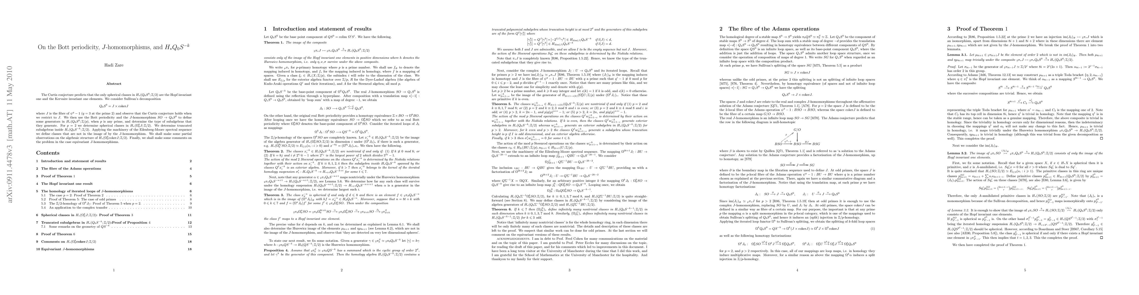 The Curtis conjecture predicts that the only spherical classes in $H_*(Q_0S^0;\Z/2)$ are the Hopf invariant one and the Kervaire invariant one elements. We consider Sullivan's decomposition $$Q_0S^0=J\times\cok J$$ where $J$ is the fibre of $\psi^q-1$ ($q=3$ at the prime $2$) and observe that the Curtis conjecture holds when we restrict to $J$. We then use the Bott periodicity and the $J$-homomorphism $SO\to Q_0S^0$ to define some generators in $H_*(Q_0S^0;\Z/p)$, when $p$ is any prime, and determine the type of subalgebras that they generate. For $p=2$ we determine spherical classes in $H_*(\Omega^k_0J;\Z/2)$. We determine truncated subalgebras inside $H_*(Q_0S^{-k};\Z/2)$. Applying the machinery of the Eilenberg-Moore spectral sequence we define classes that are not in the image of by the $J$-homomorphism. We shall make some partial observations on the algebraic structure of $H_*(\Omega^k_0\cok J;\Z/2)$. Finally, we shall make some comments on the problem in the case equivariant $J$-homomorphisms.