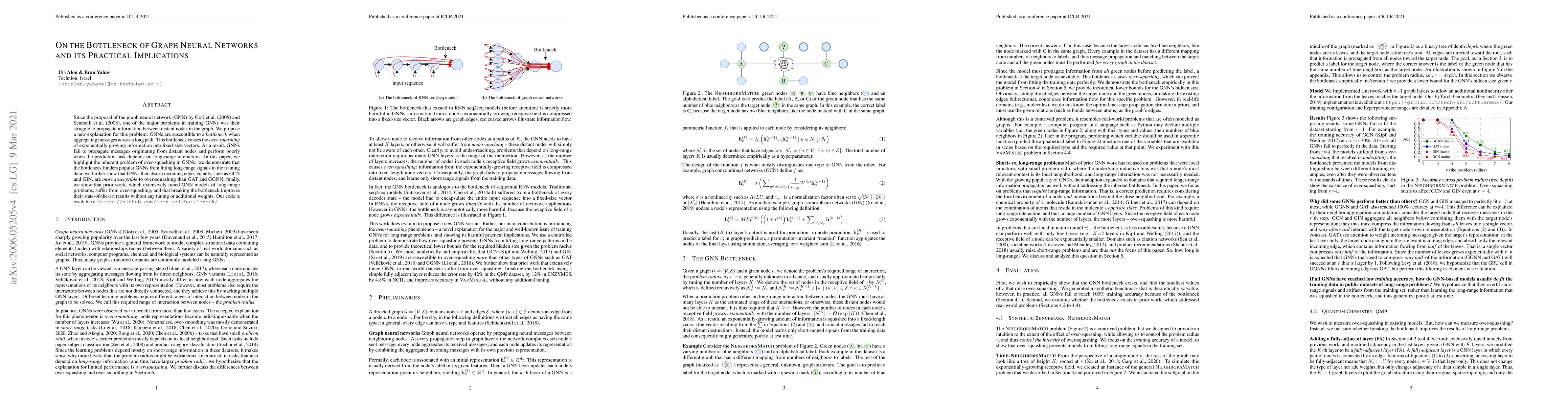 Since the proposal of the graph neural network (GNN) by Gori et al. (2005) and Scarselli et al. (2008), one of the major problems in training GNNs was their struggle to propagate information between distant nodes in the graph. We propose a new explanation for this problem: GNNs are susceptible to a bottleneck when aggregating messages across a long path. This bottleneck causes the over-squashing of exponentially growing information into fixed-size vectors. As a result, GNNs fail to propagate messages originating from distant nodes and perform poorly when the prediction task depends on long-range interaction. In this paper, we highlight the inherent problem of over-squashing in GNNs: we demonstrate that the bottleneck hinders popular GNNs from fitting long-range signals in the training data; we further show that GNNs that absorb incoming edges equally, such as GCN and GIN, are more susceptible to over-squashing than GAT and GGNN; finally, we show that prior work, which extensively tuned GNN models of long-range problems, suffers from over-squashing, and that breaking the bottleneck improves their state-of-the-art results without any tuning or additional weights. Our code is available at https://github.com/tech-srl/bottleneck/ .
