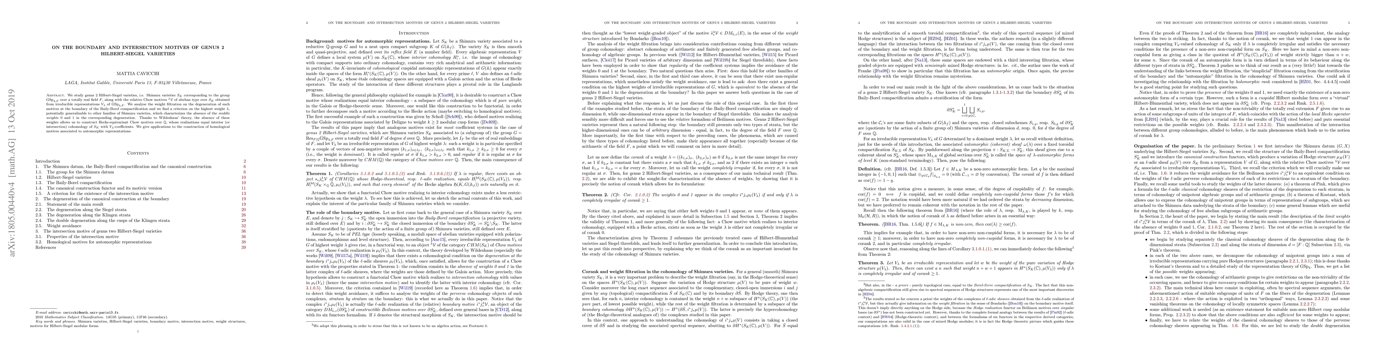 We study genus 2 Hilbert-Siegel varieties, i.e. Shimura varieties $S_K$ corresponding to the group $\mbox{GSp}_{4,F}$ over a totally real field $F$, along with the relative Chow motives $^\lambda \mathcal{V}$ of abelian type over $S_K$ obtained from irreducible representations $V_{\lambda}$ of $\mbox{GSp}_{4,F}$. We analyse the weight filtration on the degeneration of such motives at the boundary of the Baily-Borel compactification and we find a criterion on the highest weight $\lambda$ which characterises the absence of the middle weights 0 and 1 in the corresponding degeneration. Thanks to Wildeshaus' theory, the absence of these weights allows us to construct Hecke-equivariant Chow motives over $\mathbb{Q}$, whose realizations equal interior (or intersection) cohomology of $S_K$ with $V_{\lambda}$-coefficients. We give applications to the construction of motives associated to automorphic representations.
