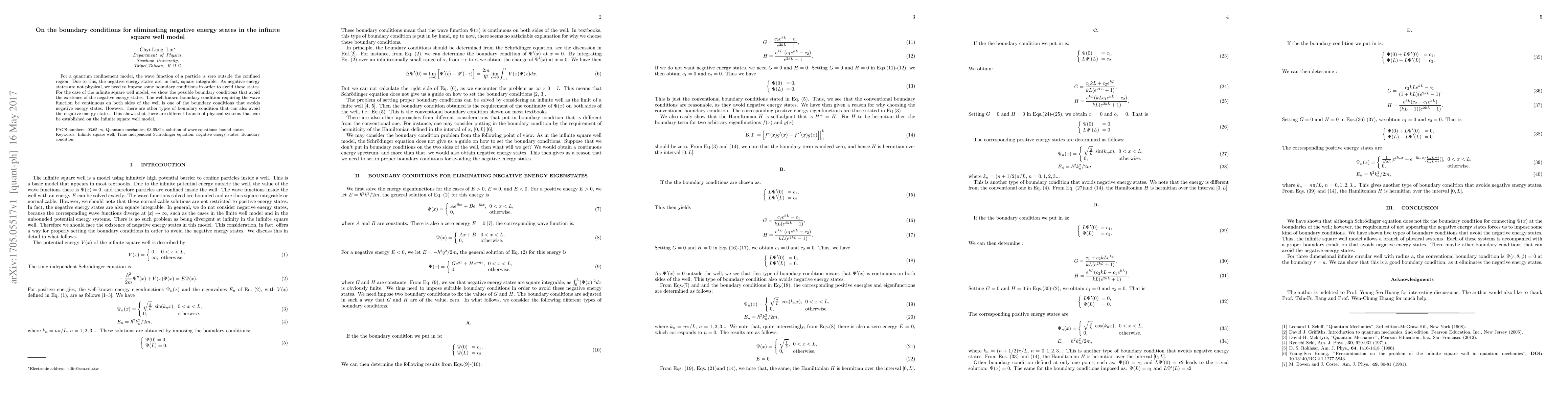 This paper explores boundary conditions for the infinite square well model to eliminate non-physical negative energy states, demonstrating that while continuity of the wave function is a known solution, alternative boundary conditions can also achieve this goal, indicating diverse physical systems within the model.
