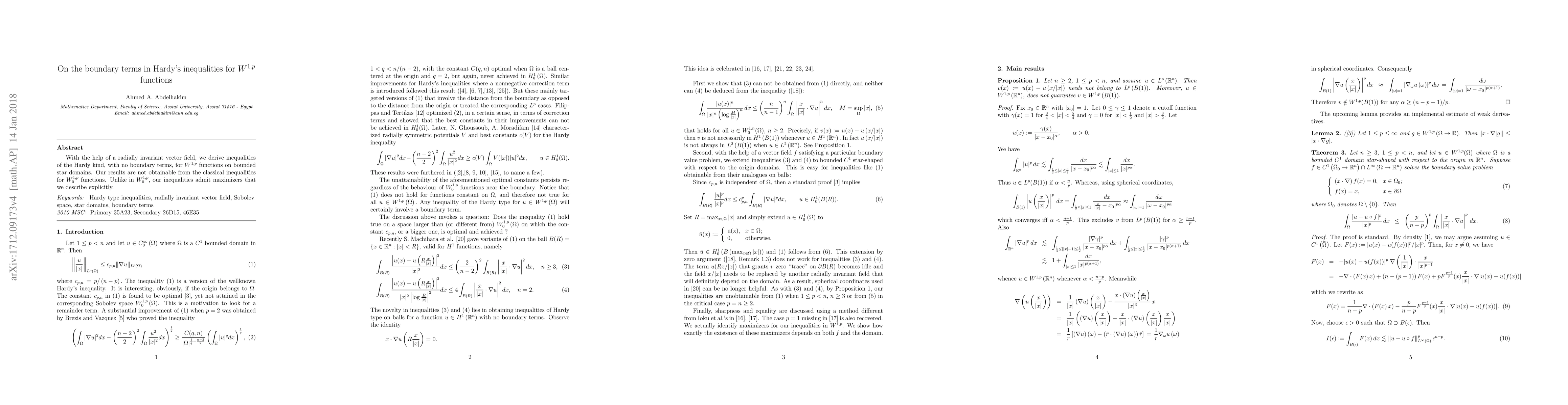 This paper derives Hardy inequalities for $W^{1,p}$ functions on bounded star domains without boundary terms, using a radially invariant vector field. These results differ from classical inequalities for $W^{1,p}_{0}$ functions and include explicit descriptions of maximizers.