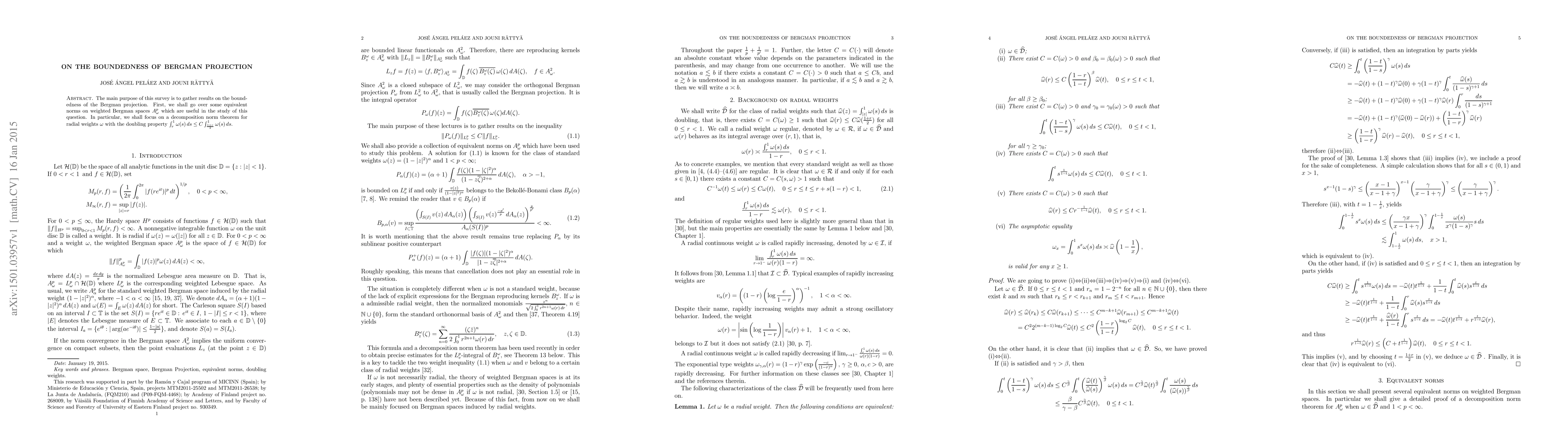 This paper surveys results on the boundedness of the Bergman projection, focusing on equivalent norms in weighted Bergman spaces $A^p_\omega$ and a decomposition norm theorem for radial weights with the doubling property.