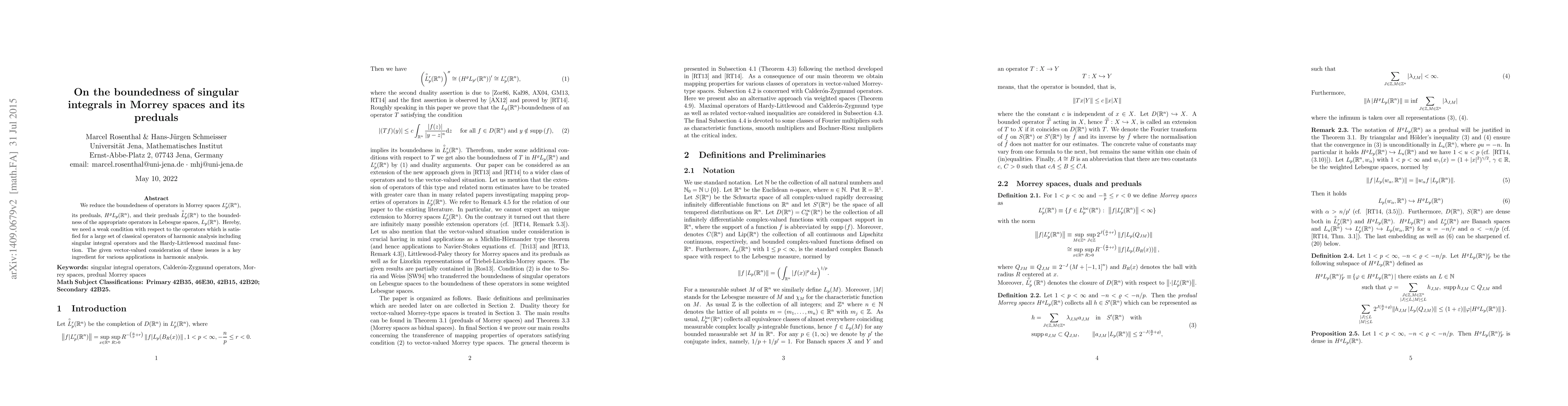 We reduce the boundedness of operators in Morrey spaces $L_p^r({\mathbb R}^n)$, its preduals, $H^{\varrho}L_p ({\mathbb R}^n)$, and their preduals $\overset{\circ}{L}{}^r_p({\mathbb R}^n)$ to the boundedness of the appropriate operators in Lebesgue spaces, $L_p({\mathbb R}^n)$. Hereby, we need a weak condition with respect to the operators which is satisfied for a large set of classical operators of harmonic analysis including singular integral operators and the Hardy-Littlewood maximal function. The given vector-valued consideration of these issues is a key ingredient for various applications in harmonic analysis.
