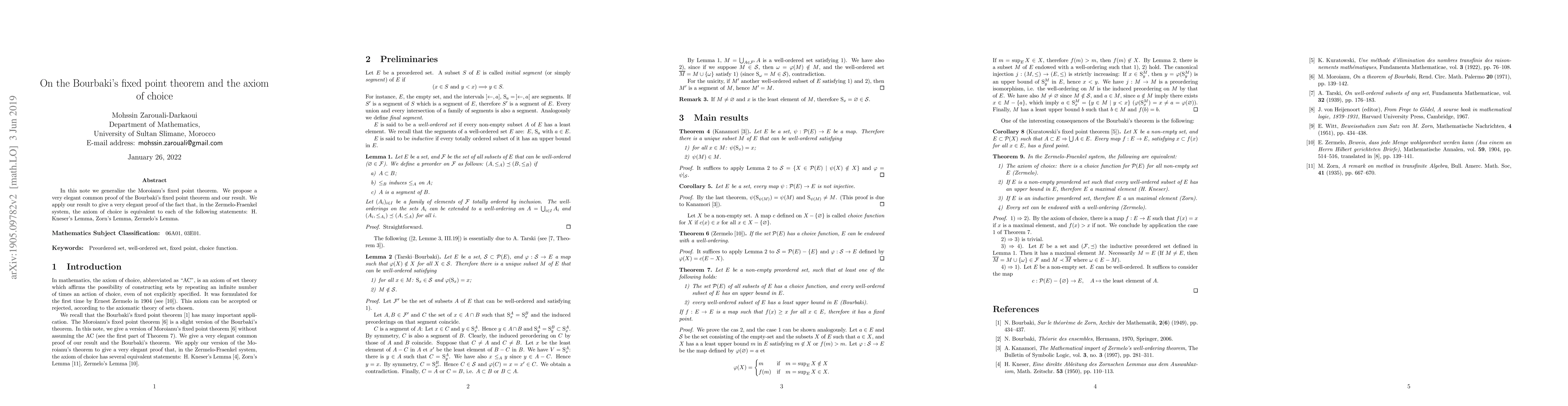 In this note we generalize the Moroianu's fixed point theorem. We propose a very elegant common proof of the Bourbaki's fixed point theorem and our result. We apply our result to give a very elegant proof of the fact that, in the Zermelo-Fraenkel system, the axiom of choice is equivalent to each of the following statements: H. Kneser's Lemma, Zorn's Lemma, Zermelo's Lemma