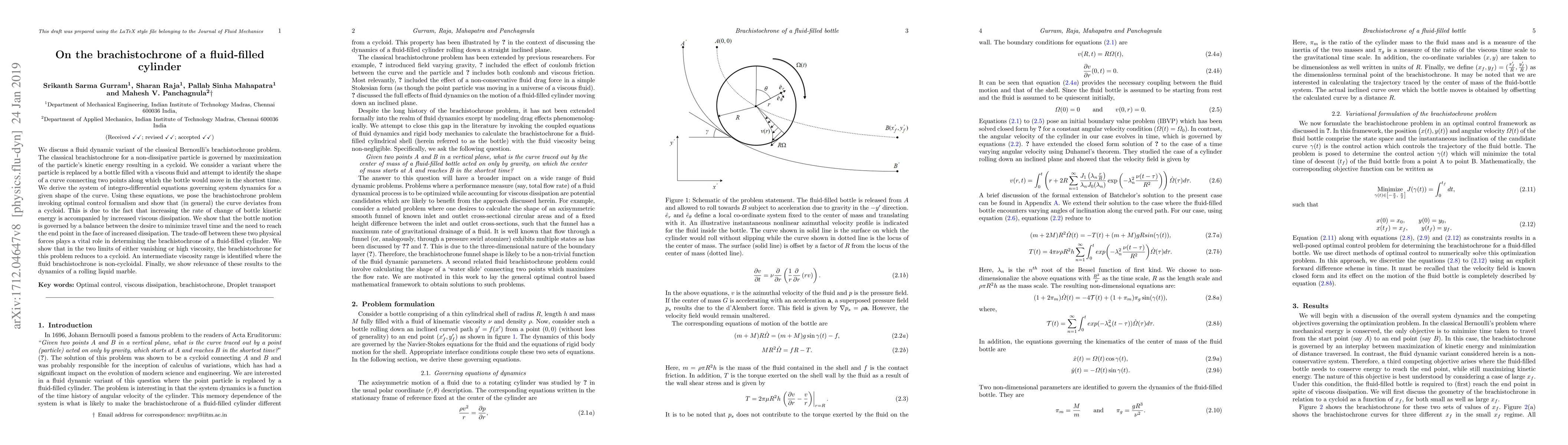 This paper explores a fluid dynamic variant of Bernoulli's brachistochrone problem where a viscous fluid-filled cylinder replaces a particle, deriving integro-differential equations to determine the optimal curve for shortest time travel. It finds that the optimal path deviates from a cycloid due to viscous dissipation and identifies conditions where the brachistochrone curve remains non-cycloidal.