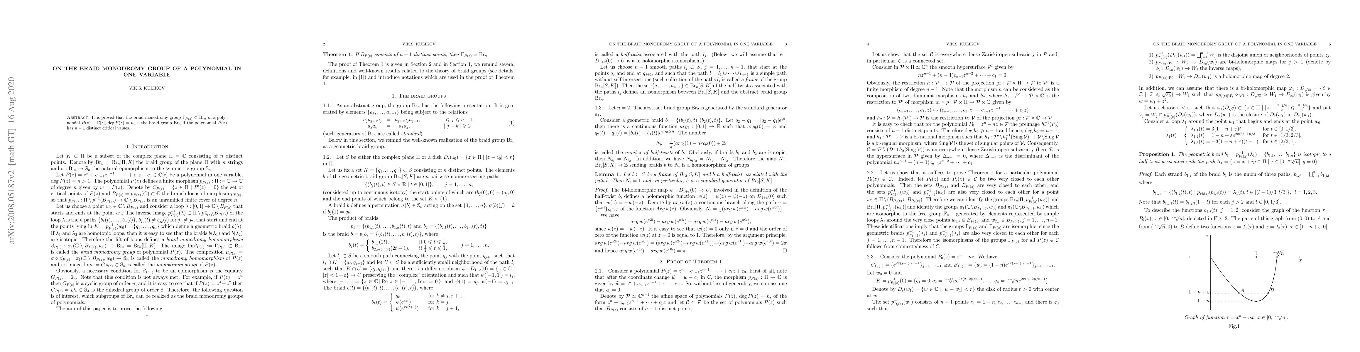 Summary: The paper proves that the braid monodromy group $\Gamma_{P(z)}$ of a polynomial $P(z)$ with $n$ distinct critical values is isomorphic to the braid group $\text{Br}_n$. This establishes a connection between polynomial critical points and braid group theory.