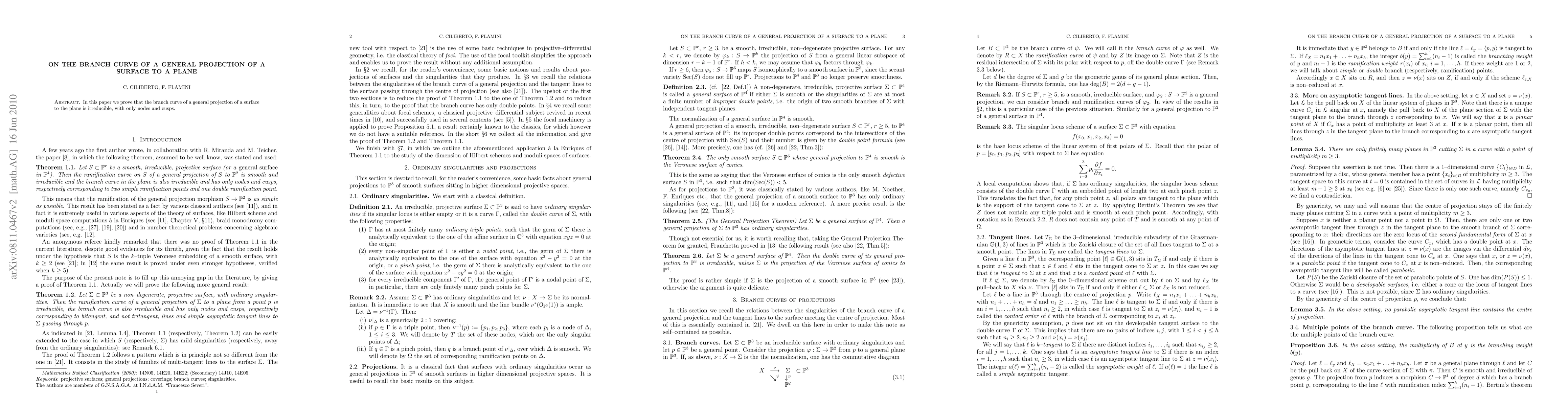 Researchers prove that the branch curve of a general surface projection to a plane is irreducible with only nodes and cusps.