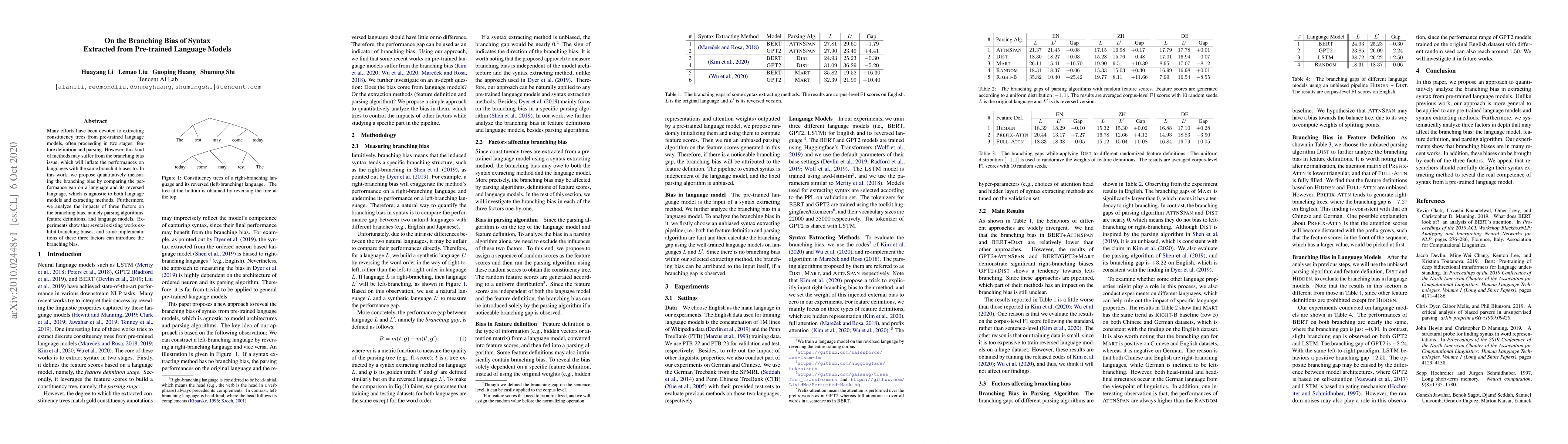 This paper proposes a method to quantify the branching bias in syntax extraction from pre-trained language models by comparing performance on a language and its reversed version. It analyzes how parsing algorithms, feature definitions, and language models influence this bias, revealing that several existing methods exhibit such biases.
