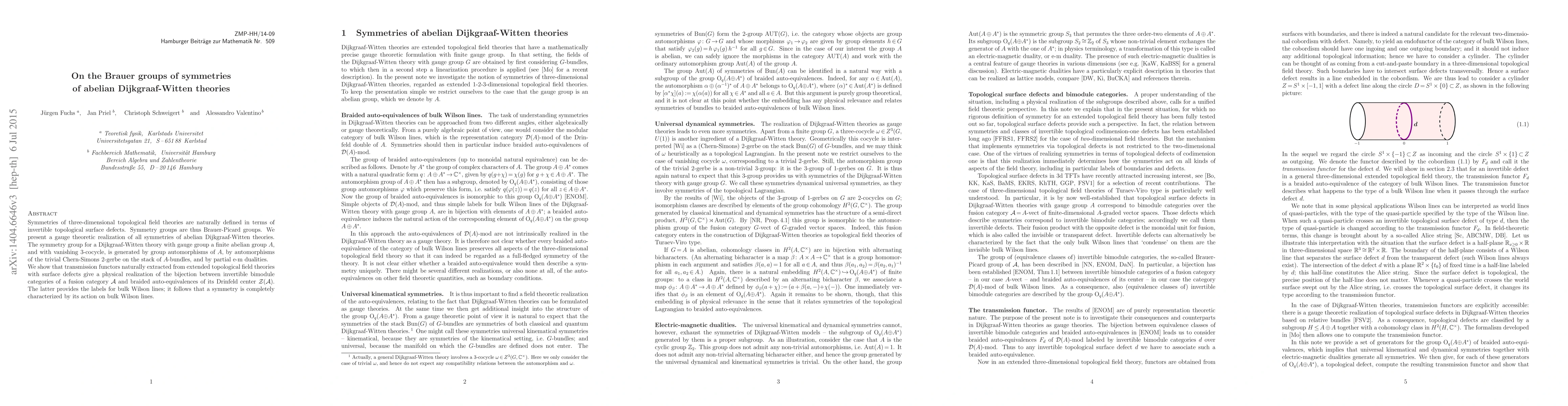 Symmetries of three-dimensional topological field theories are naturally defined in terms of invertible topological surface defects. Symmetry groups are thus Brauer-Picard groups. We present a gauge theoretic realization of all symmetries of abelian Dijkgraaf-Witten theories. The symmetry group for a Dijkgraaf-Witten theory with gauge group a finite abelian group $A$, and with vanishing 3-cocycle, is generated by group automorphisms of $A$, by automorphisms of the trivial Chern-Simons 2-gerbe on the stack of $A$-bundles, and by partial e-m dualities. We show that transmission functors naturally extracted from extended topological field theories with surface defects give a physical realization of the bijection between invertible bimodule categories of a fusion category and braided auto-equivalences of its Drinfeld center. The latter provides the labels for bulk Wilson lines; it follows that a symmetry is completely characterized by its action on bulk Wilson lines.