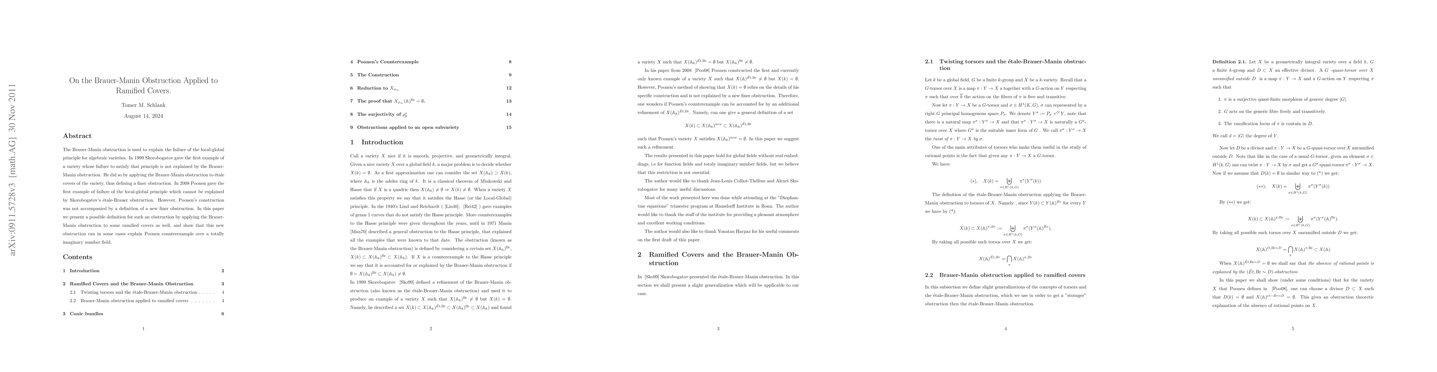 The Brauer-Manin obstruction is used to explain the failure of the local-global principle for algebraic varieties. In 1999 Skorobogatov gave the first example of a variety that does not satisfy the local-global principle which is not explained by the Brauer-Manin obstruction. He did so by applying the Brauer-Manin obstruction to \'etale covers of the variety, and thus defining a finer obstruction. In 2008 Poonen gave the first example of failure of the local-global principle which cannot be explained for by Skorobogatov's \'etale-Brauer obstruction. However, Poonen's construction was not accompanied by a definition of a new finer obstruction. In this paper I shall present a possible definition for such an obstruction by allowing to apply the Brauer-Manin obstruction to some ramified covers as well, and show that this new obstruction can explain Poonen counterexample in the case of a totally imaginary number field.