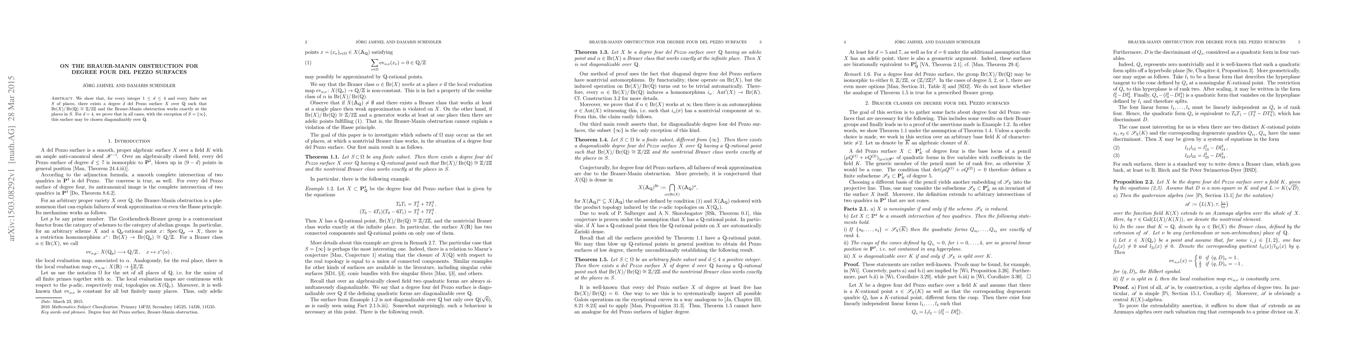 This paper demonstrates the existence of degree four del Pezzo surfaces over ${\mathbb Q}$ with a specific Brauer group structure and shows that the Brauer-Manin obstruction applies precisely at given finite sets of places, with the exception that for $d=4$ and $S \neq \{\infty\}$, these surfaces can be chosen to be diagonalizable over ${\mathbb Q}$.