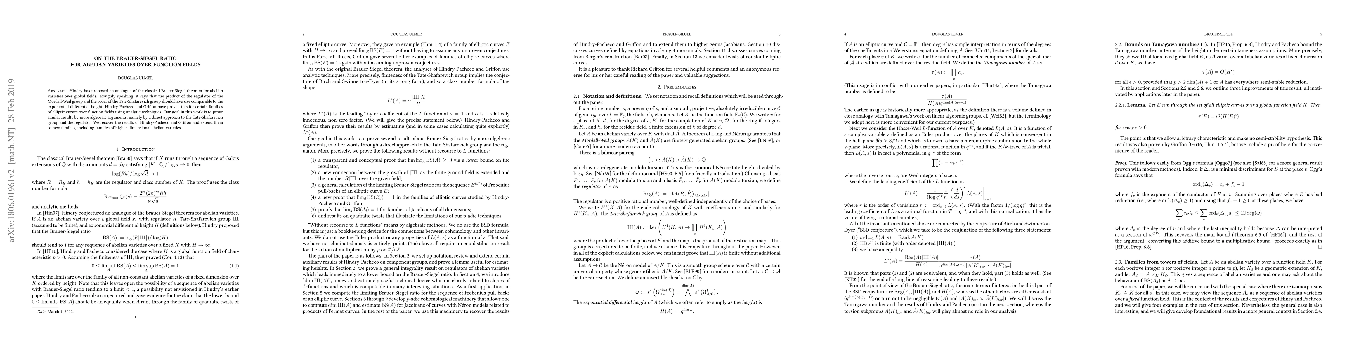 Hindry has proposed an analogue of the classical Brauer-Siegel theorem for abelian varieties over global fields. Roughly speaking, it says that the product of the regulator of the Mordell-Weil group and the order of the Tate-Shafarevich group should have size similar to the exponential differential height. Hindry-Pacheco and Griffon have proved this for certain families of elliptic curves over function fields using analytic techniques. Our goal in this work is to prove similar results by more algebraic arguments, namely by a direct approach to the Tate-Shafarevich group and the regulator. We recover the results of Hindry-Pacheco and Griffon and extend them to new families, including families of higher-dimensional abelian varieties.