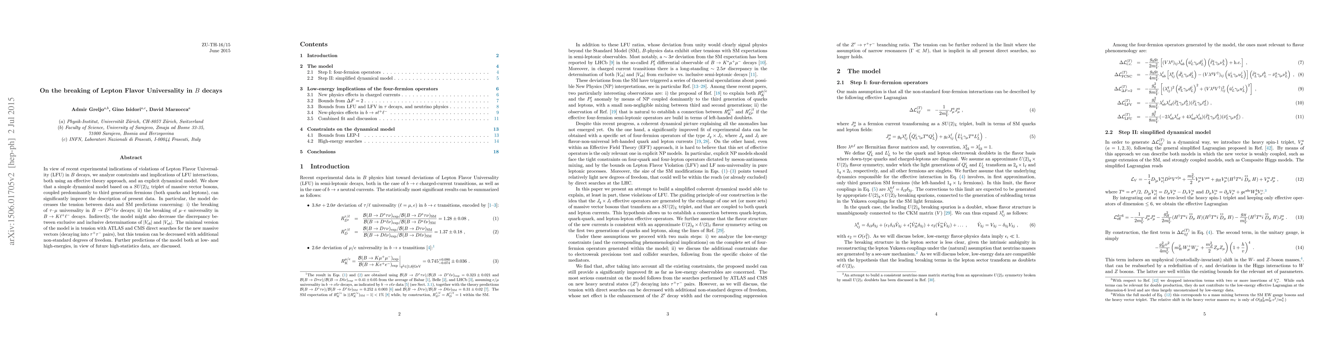 This paper investigates the breaking of Lepton Flavor Universality in $B$ decays, proposing a $SU(2)_L$ triplet of massive vector bosons to explain recent experimental anomalies. The model alleviates discrepancies between observed data and Standard Model predictions in several decay processes.