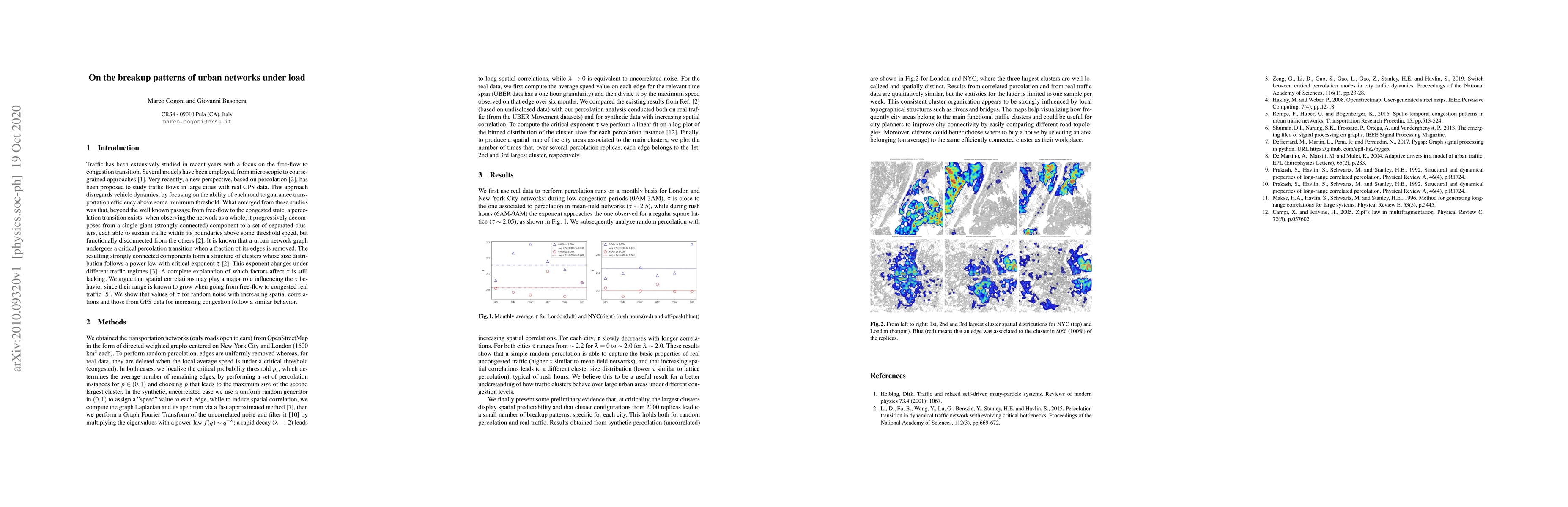 The urban networks of London and New York City are investigated as directed graphs within the paradigm of graph percolation. It has been recently observed that urban networks show a critical percolation transition when a fraction of edges are removed. The resulting strongly connected components form a cluster structure whose size distribution follows a power law with critical exponent $\tau$. We start by analyzing how the networks react when subjected to increasingly widespread random edge removal and the effect of spatial correlations with power-law decay. We observe a progressive decrease of $\tau$ as spatial correlations grow. A similar phenomenon happens when real traffic data (UBER) is used to delete congested graph edges: during low congestion periods $\tau$ is close to that obtained for uncorrelated percolation, while during rush hours the exponent becomes closer to the one obtained from spatially correlated edge removal. We show that spatial correlations seem to play an important role to model different traffic regimes. We finally present some preliminary evidence that, at criticality, the largest clusters display spatial predictability and that cluster configurations form a taxonomy with few main clades: only a finite number of breakup patterns, specific for each city, exists. This holds both for random percolation and real traffic, where the three largest clusters are well localized and spatially distinct. This consistent cluster organization is strongly influenced by local topographical structures such as rivers and bridges.