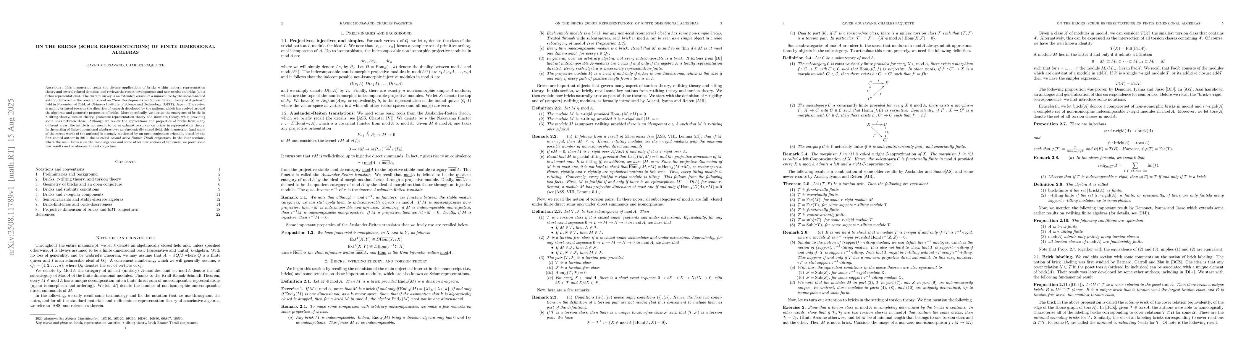 This manuscript treats the diverse applications of bricks within modern representation theory and several related domains, and reviews the recent developments and new results on bricks (a.k.a Schur representations). The current survey is an extended version of a mini-course by the second-named author, delivered in the research school on ``New Developments in Representation Theory of Algebras", held in November of 2024, at Okinawa Institute of Science and Technology (OIST), Japan. The review is mainly oriented towards the direction of research developed by the authors, which has evolved around the algebraic and geometric properties of bricks. More specifically, we discuss the emergence of bricks in $\tau$-tilting theory, torsion theory, geometric representation theory and invariant theory, while providing some links between those. Although we review the applications and properties of bricks from many different areas, the article is not meant to be an exhaustive survey on bricks in representation theory. In the setting of finite dimensional algebras over an algebraically closed field, this manuscript (and many of the recent works of the authors) is strongly motivated by an open conjecture originally posed by the first-named author in 2019, the so-called \emph{second brick Brauer-Thrall conjecture}. In the later sections, where the main focus is on the tame algebras and some other new notions of tameness, we prove some new results on the aforementioned conjecture.