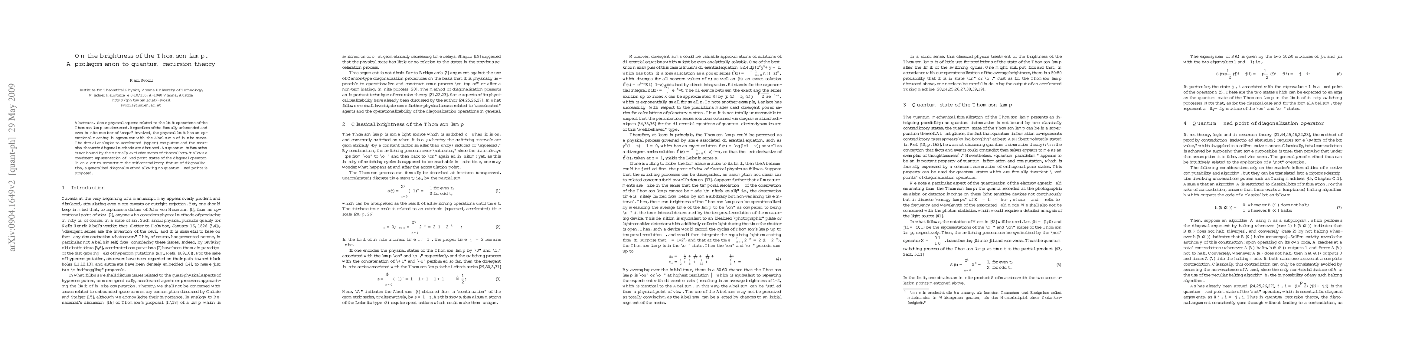 Some physical aspects related to the limit operations of the Thomson lamp are discussed. Regardless of the formally unbounded and even infinite number of "steps" involved, the physical limit has an operational meaning in agreement with the Abel sums of infinite series. The formal analogies to accelerated (hyper-) computers and the recursion theoretic diagonal methods are discussed. As quantum information is not bound by the mutually exclusive states of classical bits, it allows a consistent representation of fixed point states of the diagonal operator. In an effort to reconstruct the self-contradictory feature of diagonalization, a generalized diagonal method allowing no quantum fixed points is proposed.