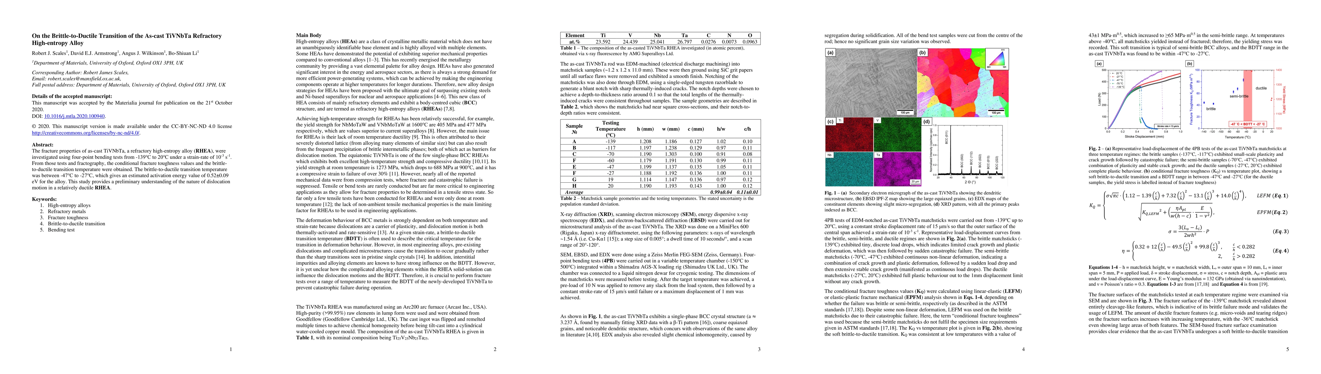 This study investigates the fracture properties and brittle-to-ductile transition of as-cast TiVNbTa refractory high-entropy alloy through four-point bending tests, identifying a transition temperature range of -47C to -27C with an activation energy of 0.52±0.09 eV.