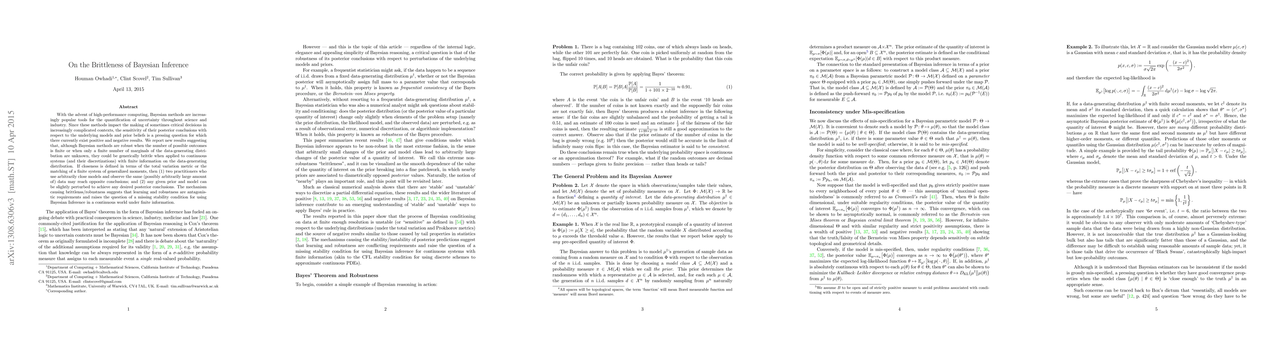 Bayesian inference can be brittle when applied to continuous systems with finite information on the data-generating distribution, leading to sensitive results from small changes in models or prior beliefs.