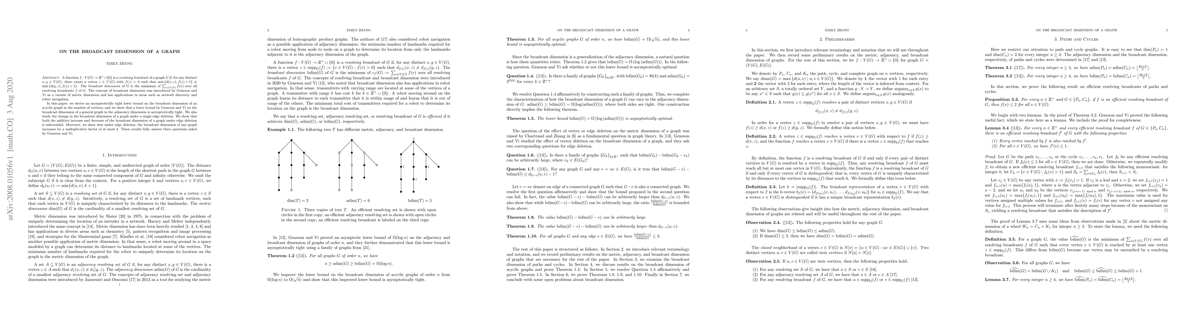 A function $f:V(G)\rightarrow \mathbb{Z}^+ \cup \{0\}$ is a resolving broadcast of a graph $G$ if, for any distinct $x,y\in V(G)$, there exists a vertex $z\in V(G)$ with $f(z)>0$ such that $\min\{d(x,z), f(z)+1\} \neq \min\{d(y,z), f(z)+1\}.$ The broadcast dimension of $G$ is the minimum of $\sum_{v\in V(G)}f(v)$ over all resolving broadcasts $f$ of $G$. The concept of broadcast dimension was introduced by Geneson and Yi as a variant of metric dimension and has applications in areas such as network discovery and robot navigation. In this paper, we derive an asymptotically tight lower bound on the broadcast dimension of an acyclic graph in the number of vertices, and we show that a lower bound by Geneson and Yi on the broadcast dimension of a general graph in the adjacency dimension is asymptotically tight. We also study the change in the broadcast dimension of a graph under a single edge deletion. We show that both the additive increase and decrease of the broadcast dimension of a graph under edge deletion is unbounded. Moreover, we show that under edge deletion, the broadcast dimension of any graph increases by a multiplicative factor of at most 3. These results fully answer three questions asked by Geneson and Yi.