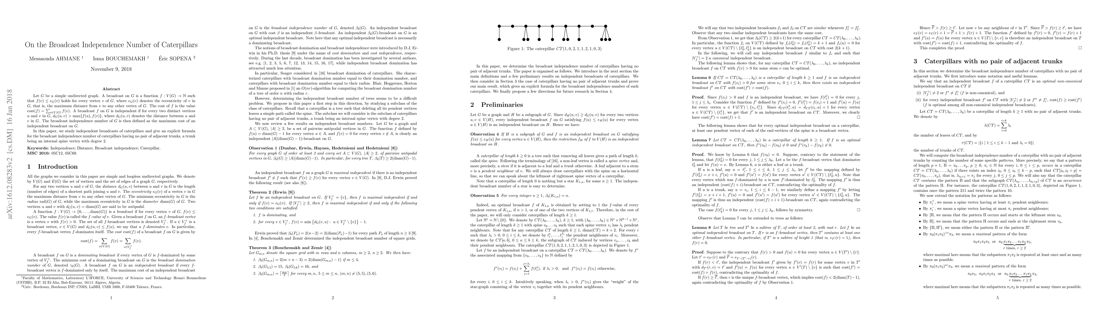 This paper investigates the broadcast independence number for caterpillars, providing a formula for the maximum cost of independent broadcasts in caterpillars without adjacent vertices of degree 2. The study focuses on the structure of these graphs to derive the explicit formula.