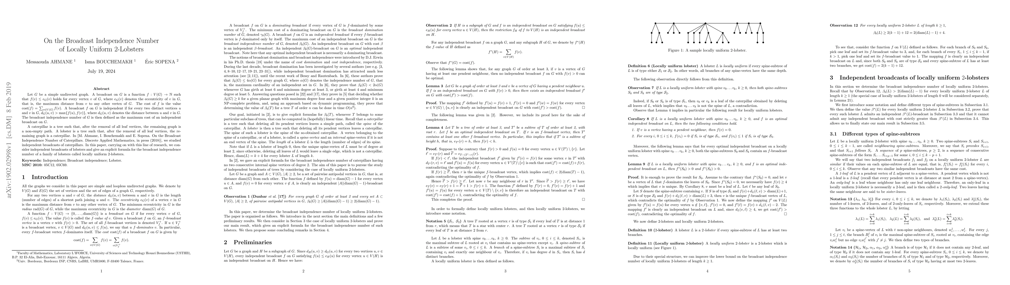 This paper investigates the broadcast independence number for locally uniform 2-lobsters, a type of tree where the remaining graph after removing leaf vertices is a caterpillar. It provides an explicit formula for the maximum cost of an independent broadcast on these graphs.