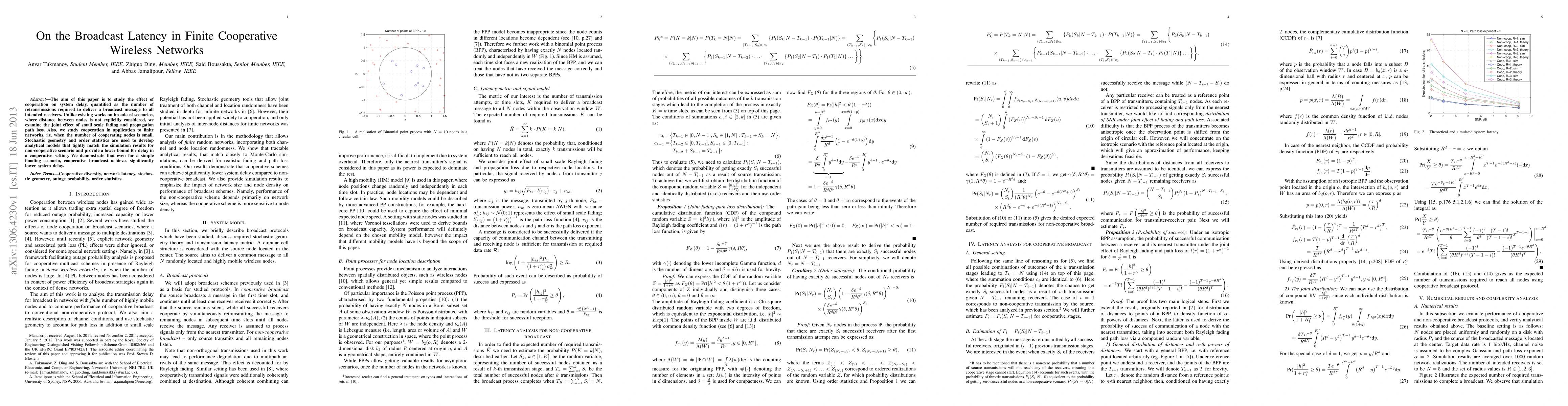 The aim of this paper is to study the effect of cooperation on system delay, quantified as the number of retransmissions required to deliver a broadcast message to all intended receivers. Unlike existing works on broadcast scenarios, where distance between nodes is not explicitly considered, we examine the joint effect of small scale fading and propagation path loss. Also, we study cooperation in application to finite networks, i.e. when the number of cooperating nodes is small. Stochastic geometry and order statistics are used to develop analytical models that tightly match the simulation results for non-cooperative scenario and provide a lower bound for delay in a cooperative setting. We demonstrate that even for a simple flooding scenario, cooperative broadcast achieves significantly lower system delay.