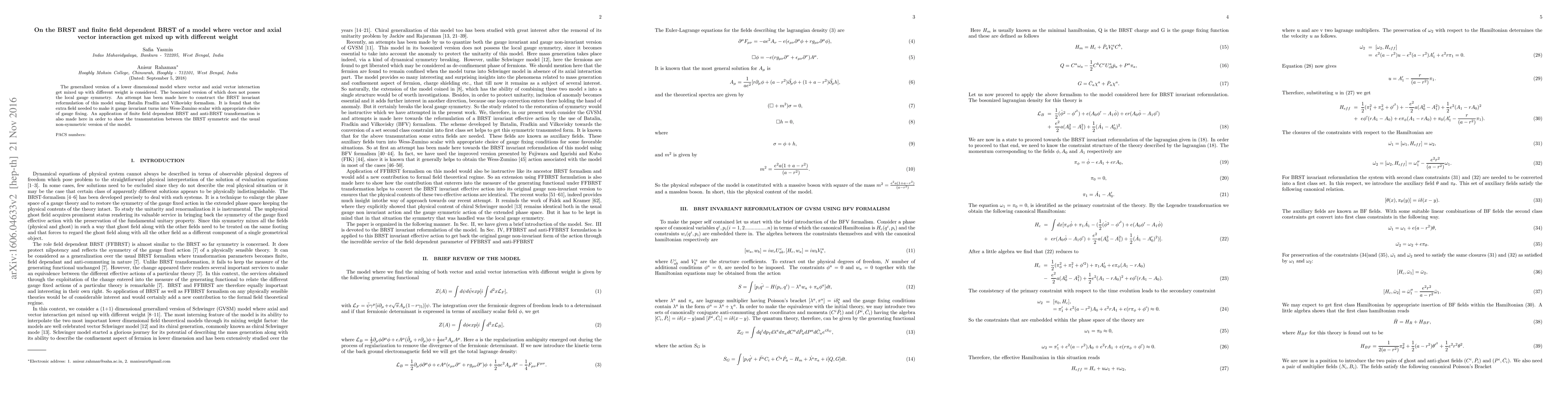 The generalized version of a lower dimensional model where vector and axial vector interaction get mixed up with different weight is considered. The bosonized version of which does not posses the local gauge symmetry. An attempt has been made here to construct BRST invariant reformulation of this model using Batalin Fradlin and Vilkovisky formalism. It is found that the extra field needed to make it gauge invariant turns into Wess-Zumino scalar with appropriate choice of gauge fixing. An application of finite field dependent BRST and anti-BRST transformation is also made here in order to show the transmutation between the BRST symmetric and the usual non-symmetric version of the model.